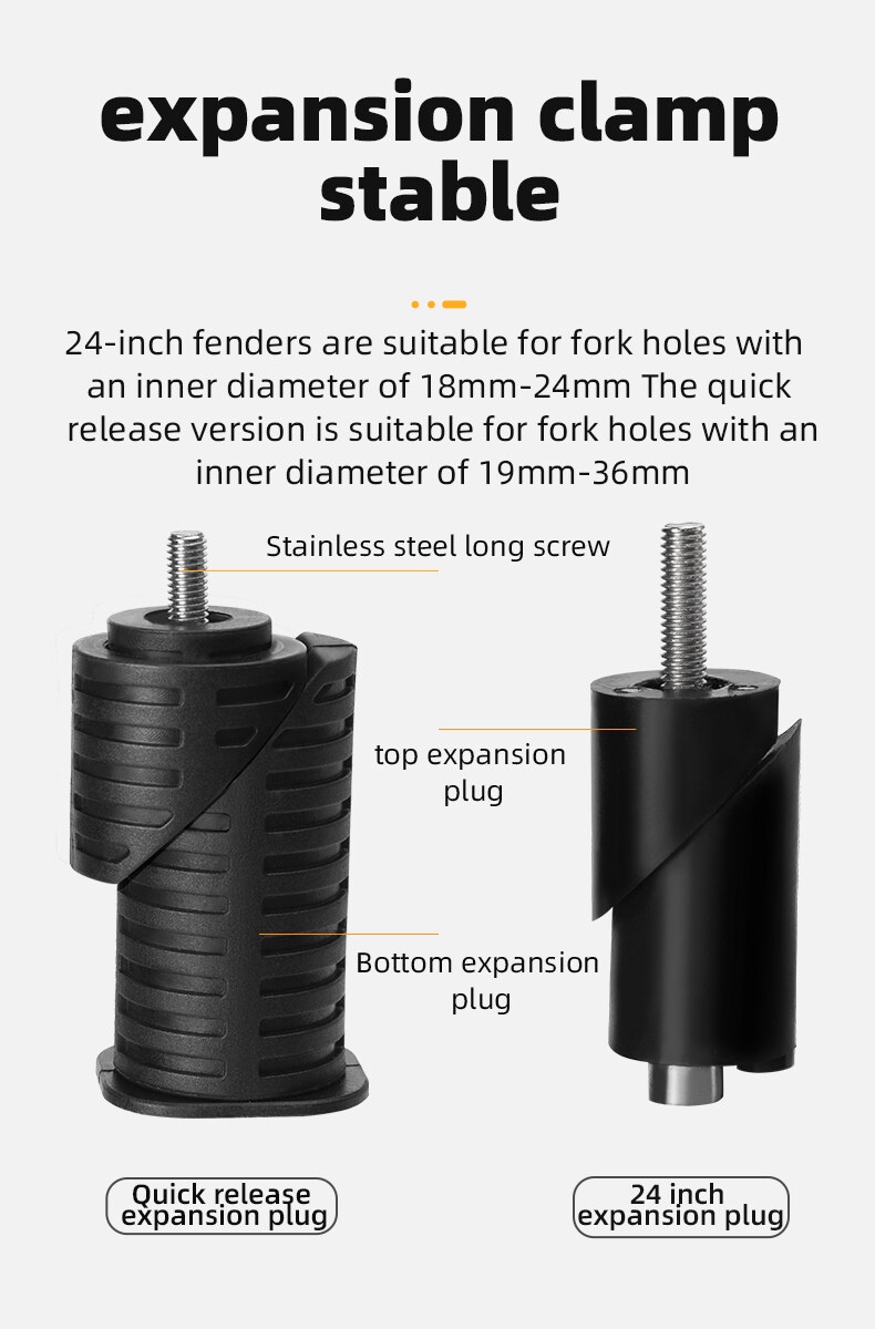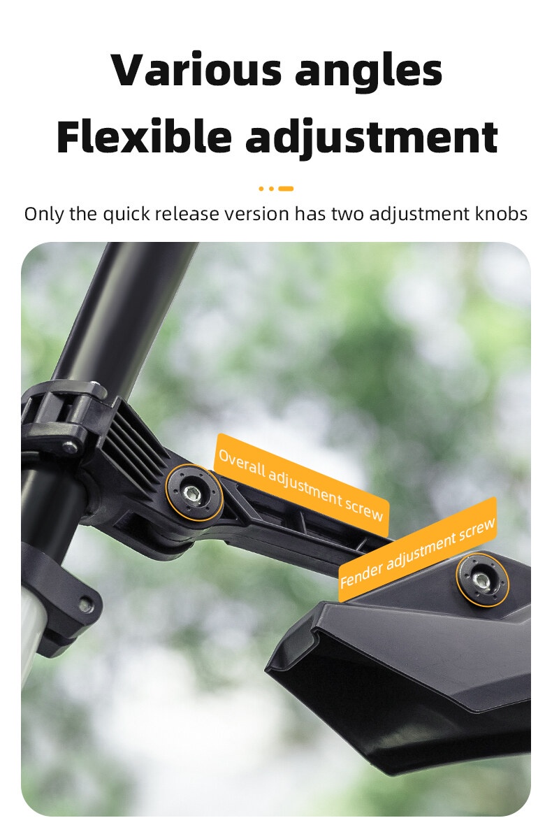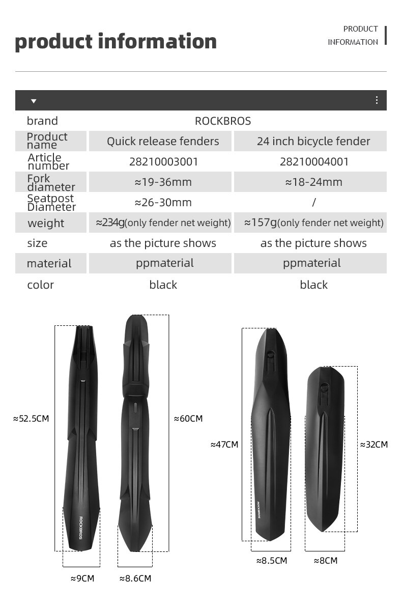Brand: ROCKBROS Name:Bicycle Fender Style:Quick Release/22-24'' Front fender: Quick Release about 52.5*9cm/22-24'' about 32*8cm Rear fender: Quick Release about 60*8.6cm/22-24'' about 47*8.5cm Weight: 234g/157g Material: PP material
