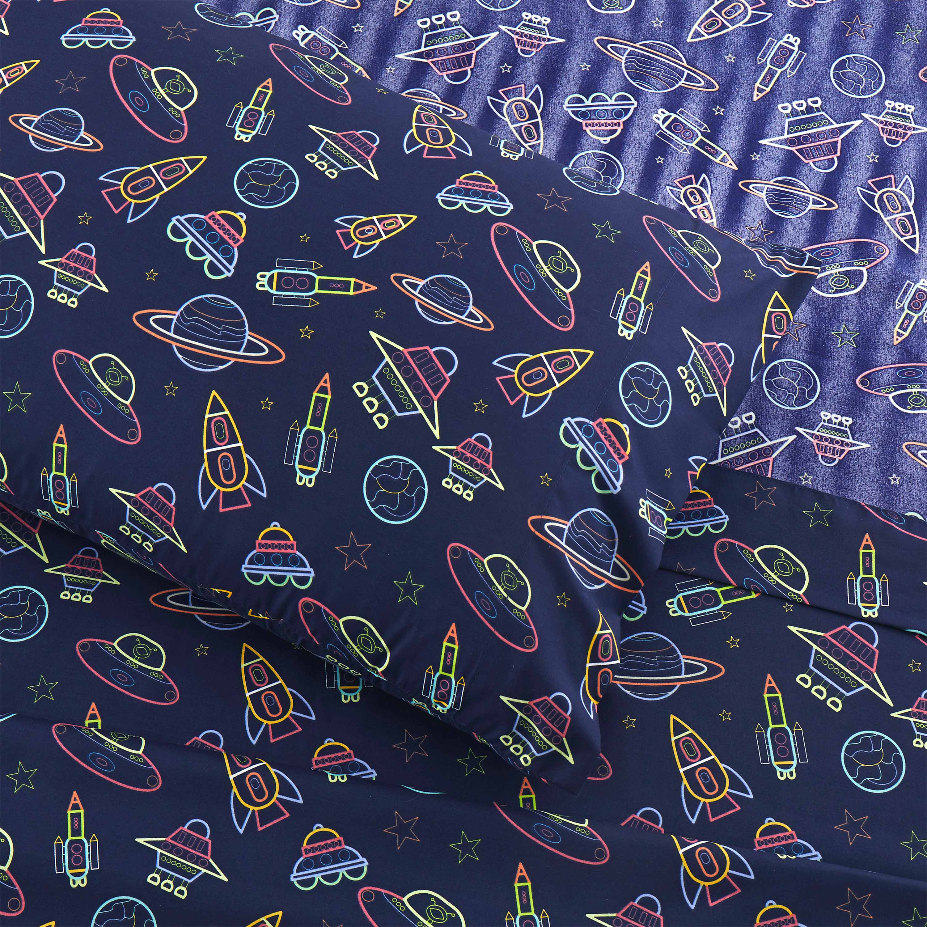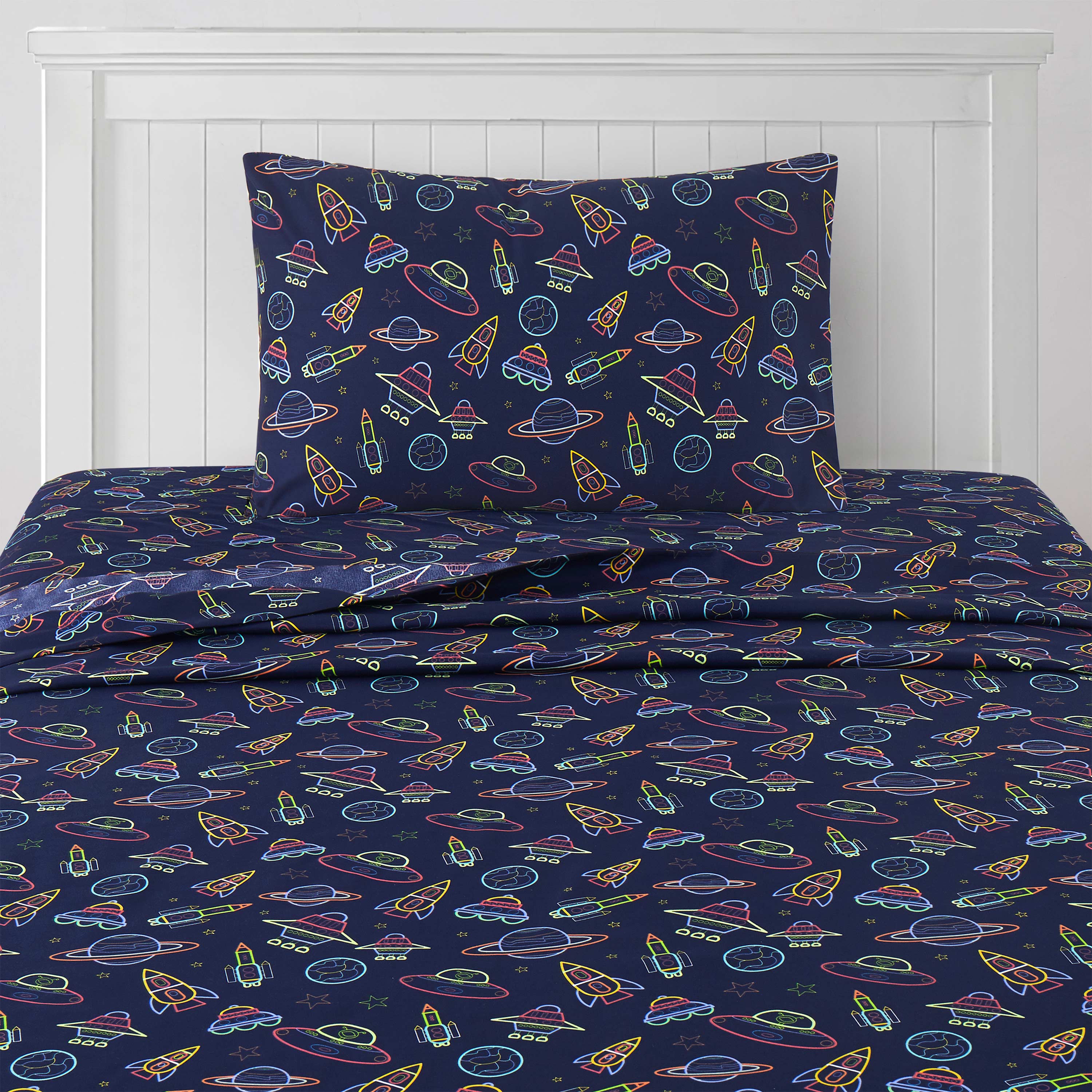 Your kids can blast into outer space with our Neon Space sheets featuring neon spaceships, stars and planets on a navy background. They will love to sleep on this ultra soft sheet set with double brushed microfiber construction.