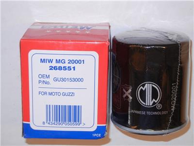 Most 1994-2016 Moto Guzzi 850 1000-1200 taller filter 30153000 = MIW oil filter 268551, oil filter by MIW of Japan, technical sponsor of MotoGP LCR Honda (sticker is on swing arm). All filters are wrapped in plastic inside the box, to prevent contamination.