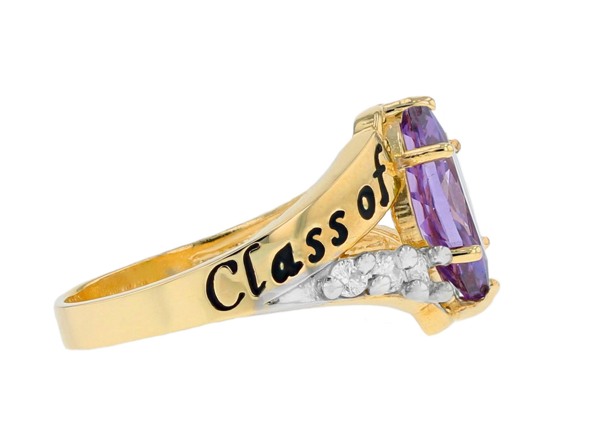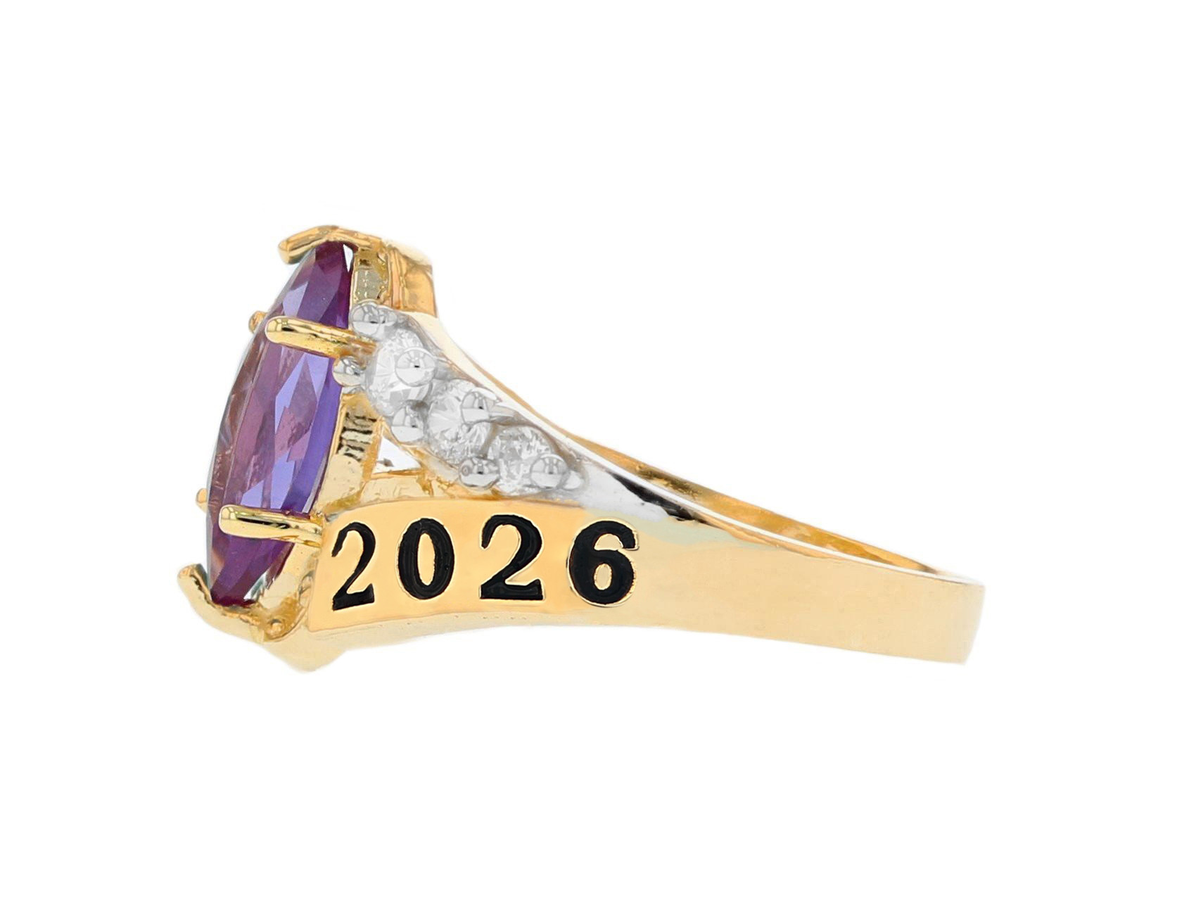 An exquisite Marquise Simulated Alexandrite is prong set atop a gorgeous band in this Class of 2026 graduation ring. Brilliant white CZ are set on a split shank on either side of the center stone and create a glow that will entrance onlookers. Only fine 10k or 14k Yellow Gold is used to craft this fine piece of jewelry. Show that graduate in your life how important their milestone is with this elegant graduation ring. Alexandrite is a birthstone for the month of June and is often associated with joy, luck, courage and love. Our rings are proudly handcrafted in our California factory.