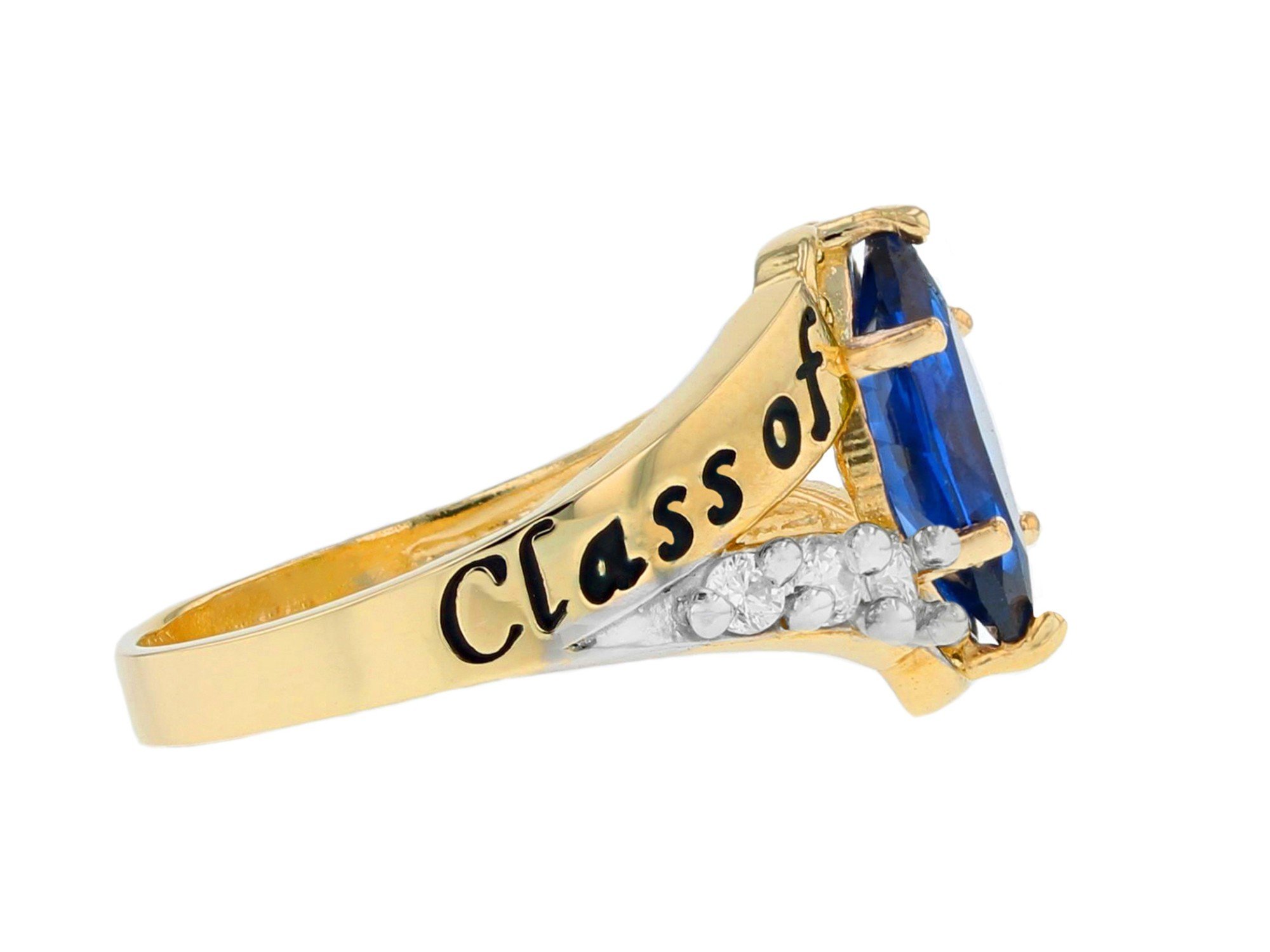 An exquisite Marquise Simulated Sapphire stone is prong set atop a gorgeous band in this Class of 2026 graduation ring. Brilliant white CZ are set on a split shank on either side of the center stone and create a glow that will entrance onlookers. Only fine 10k or 14k Two-Tone Gold is used to craft this fine piece of jewelry. Show that graduate in your life how important their milestone is with this elegant graduation ring. Sapphire is the birthstone for the month of September and symbolizes clear thinking, wisdom, serenity, purity and truth. Our rings are proudly handcrafted in our California factory.