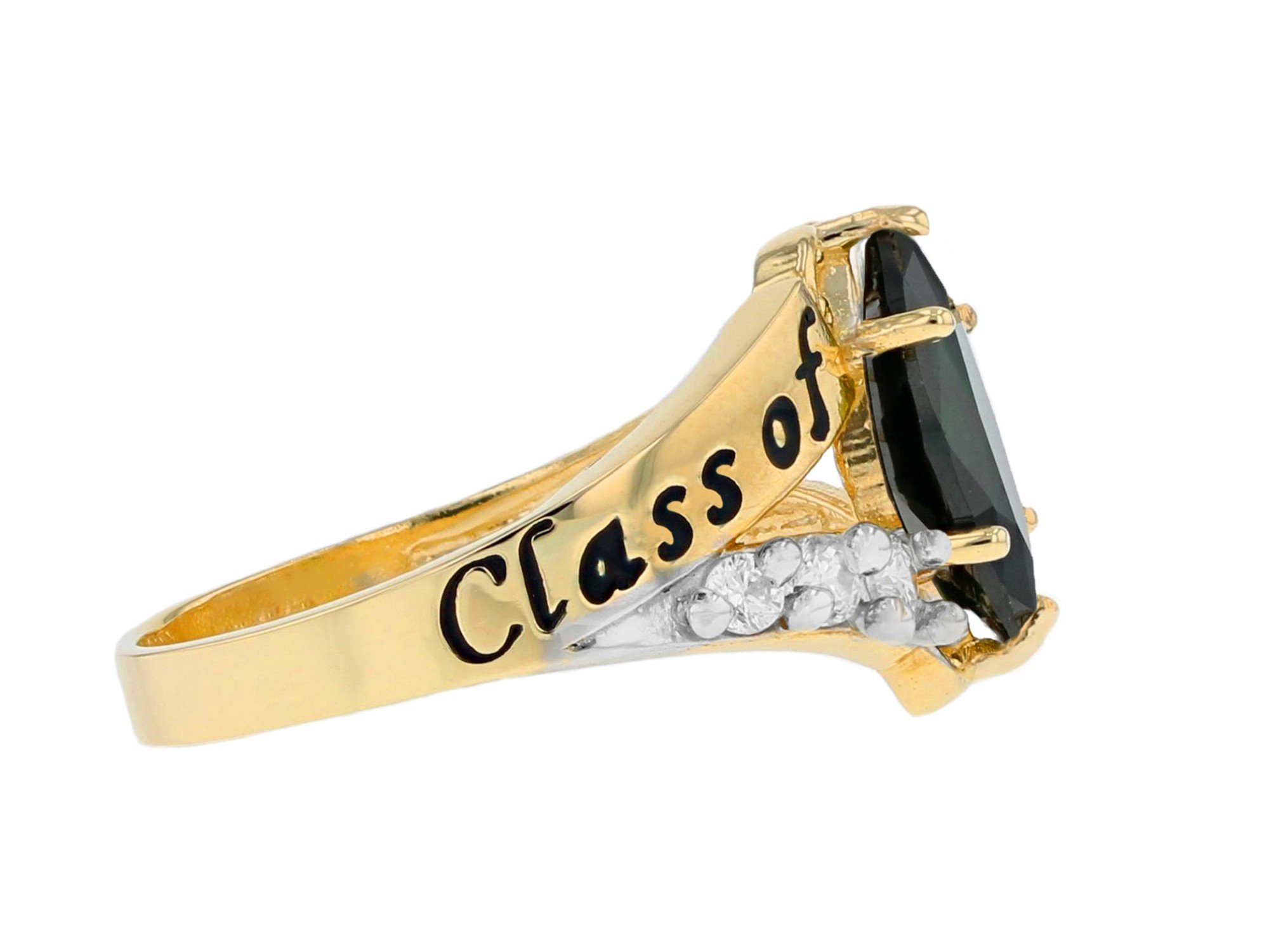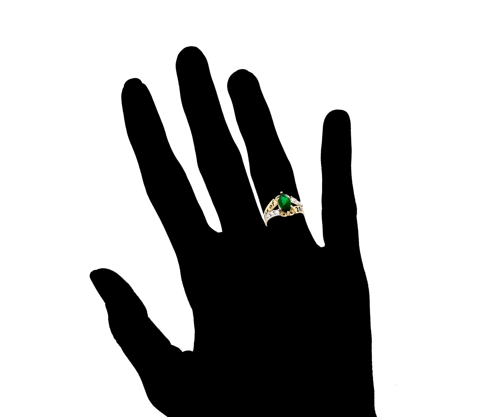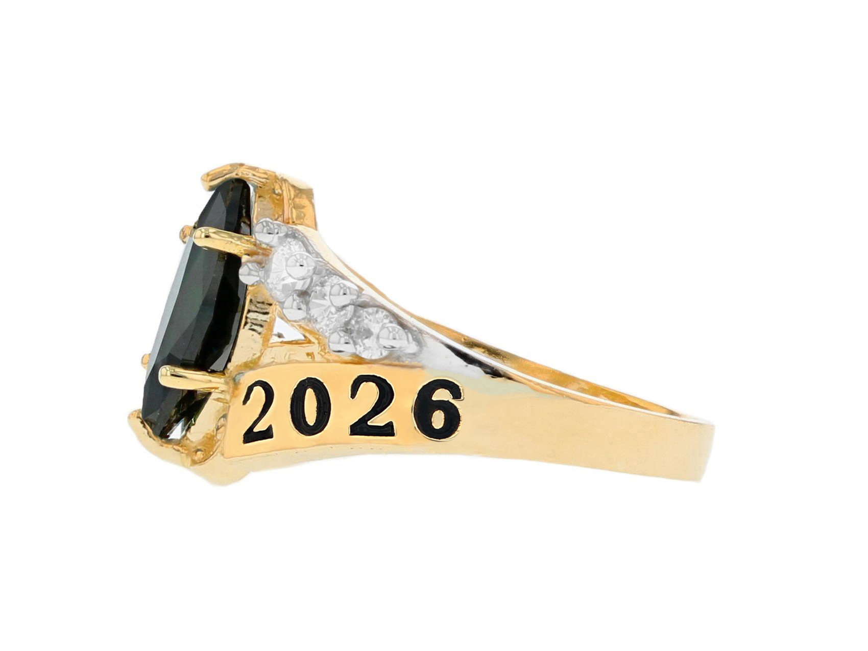 An exquisite Marquise Simulated Emerald is prong set atop a gorgeous band in this Class of 2026 graduation ring. Brilliant white CZ are set on a split shank on either side of the center stone and create a glow that will entrance onlookers. Only fine 10k or 14k Yellow Gold is used to craft this fine piece of jewelry. Show that graduate in your life how important their milestone is with this elegant graduation ring. Emerald is the birthstone for the month of May and promotes love, success, happiness and goodness. Our rings are proudly handcrafted in our California factory.