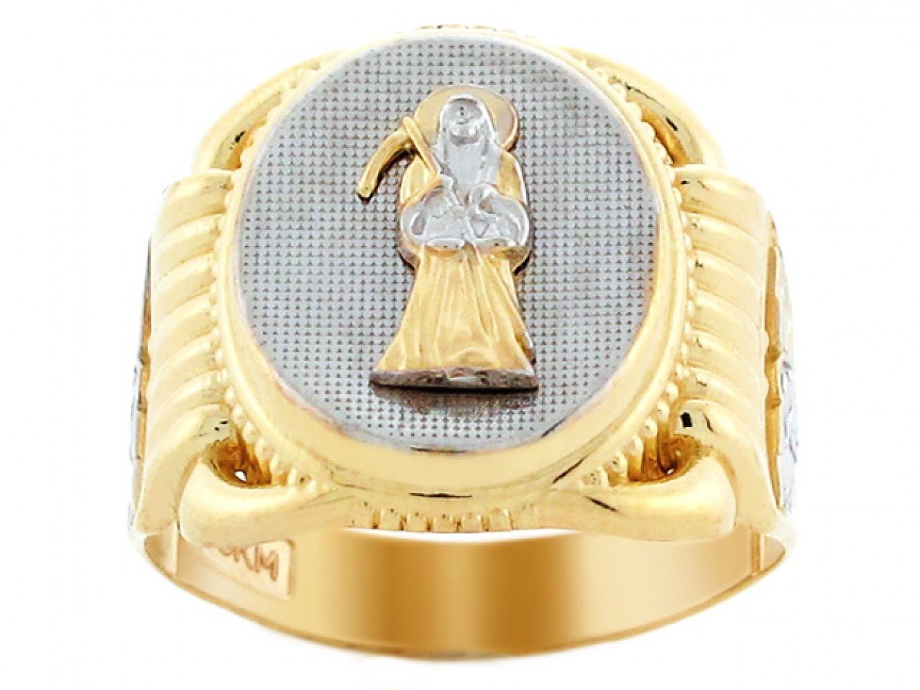 10k or 14k Two Tone Gold Religious Santa Muerte Oval Mens Ring