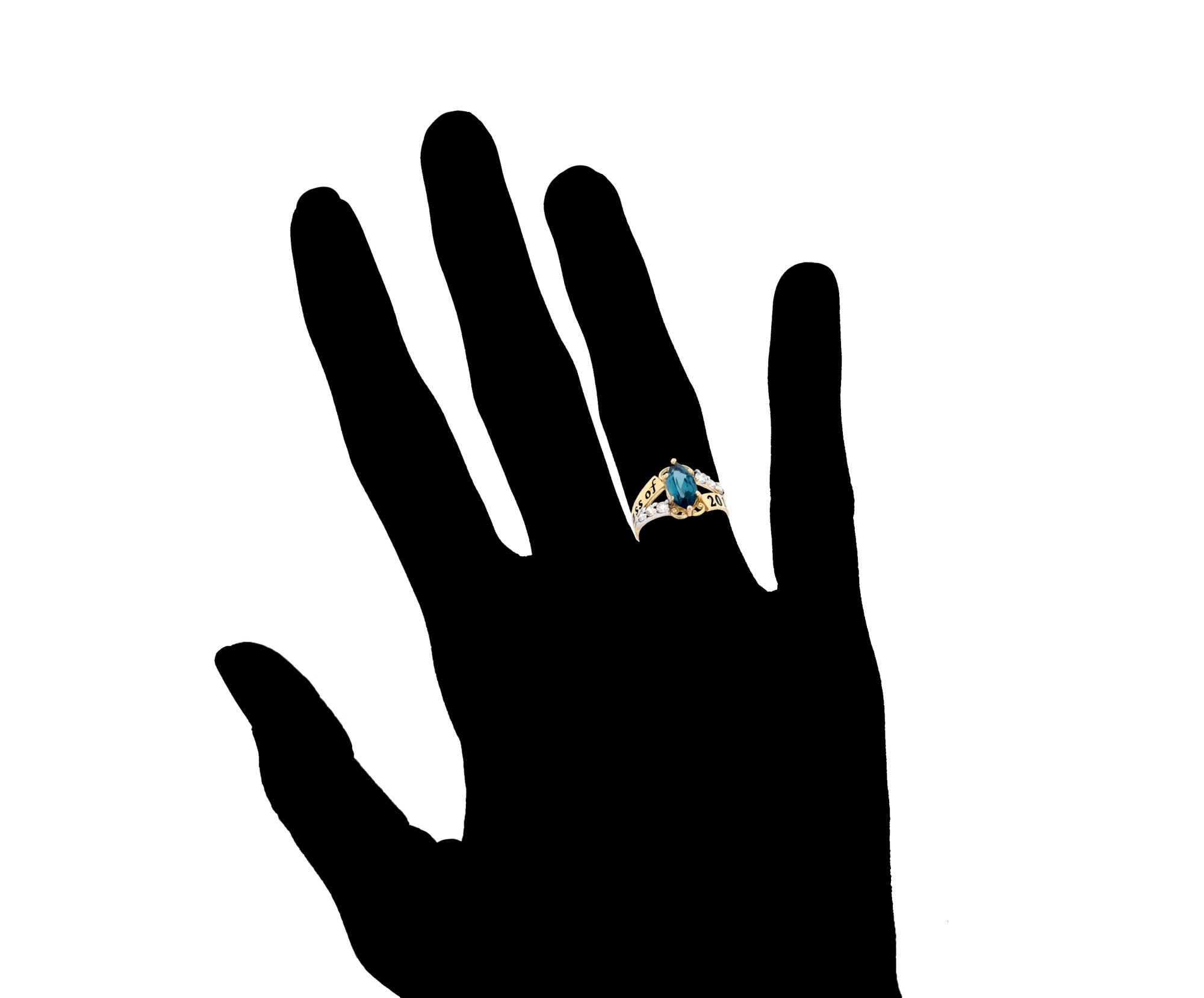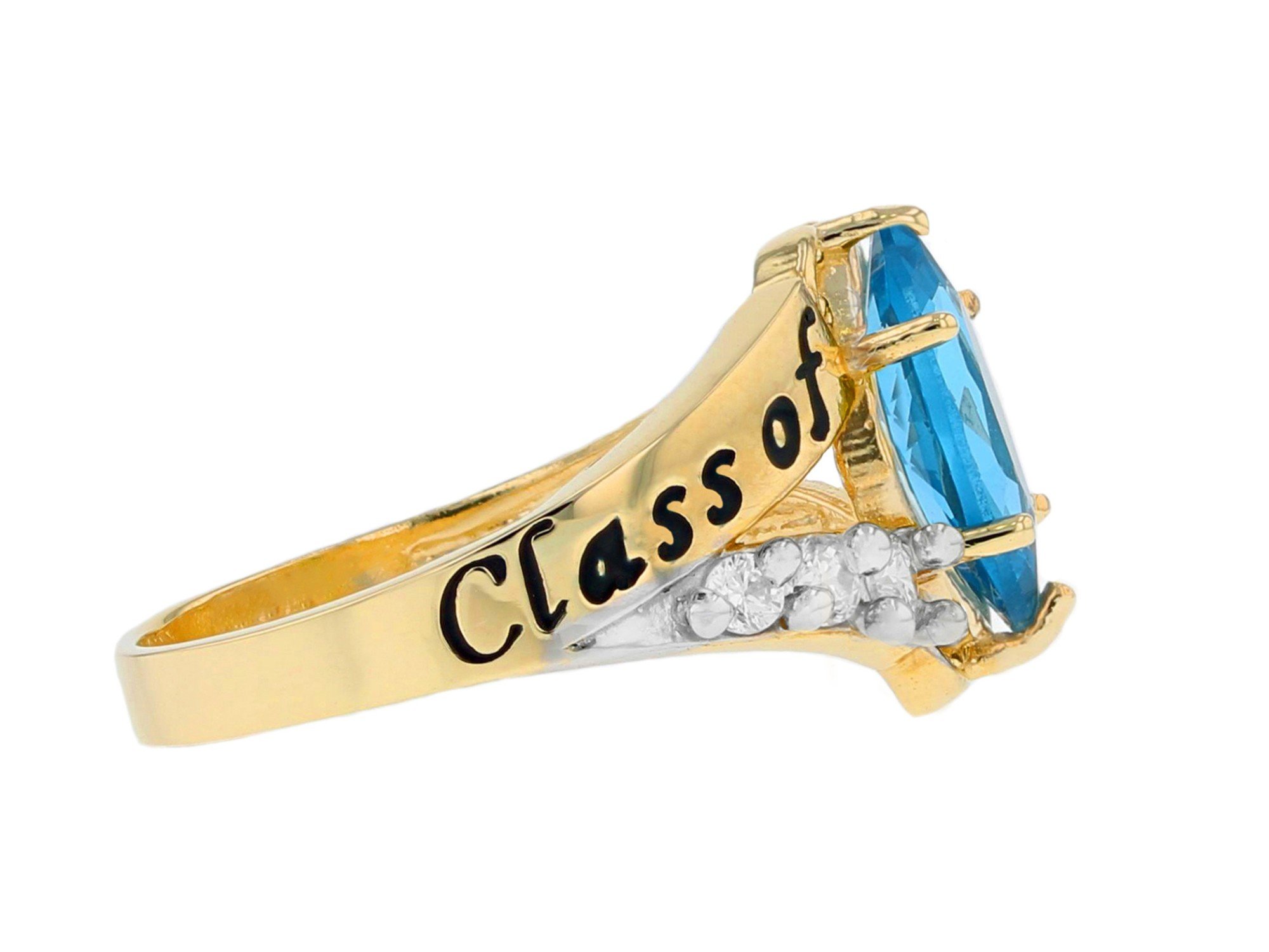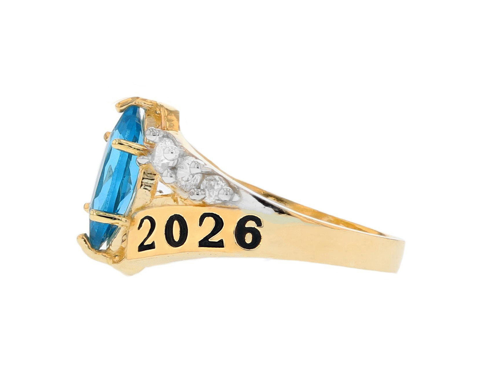 An exquisite Marquise Simulated Blue Zircon gem is prong set atop a gorgeous band in this Class of 2026 graduation ring. Brilliant white CZ are set on a split shank on either side of the center stone and create a glow that will entrance onlookers. Only fine 10k or 14k Two-Tone Gold is used to craft this fine piece of jewelry. Show that graduate in your life how important their milestone is with this elegant graduation ring. Blue Zircon is the birthstone for the month of December and stands for success, love, luck, happiness and prosperity. Our rings are proudly handcrafted in our California factory.