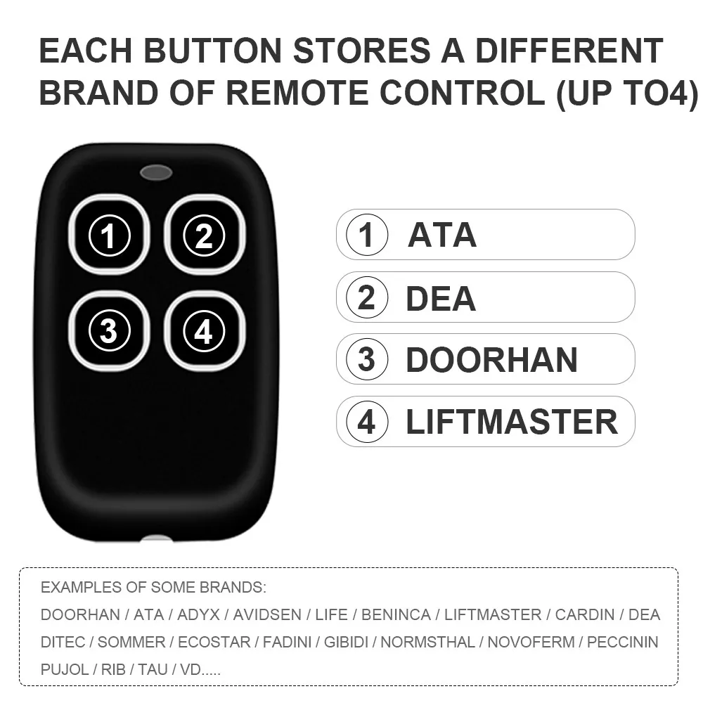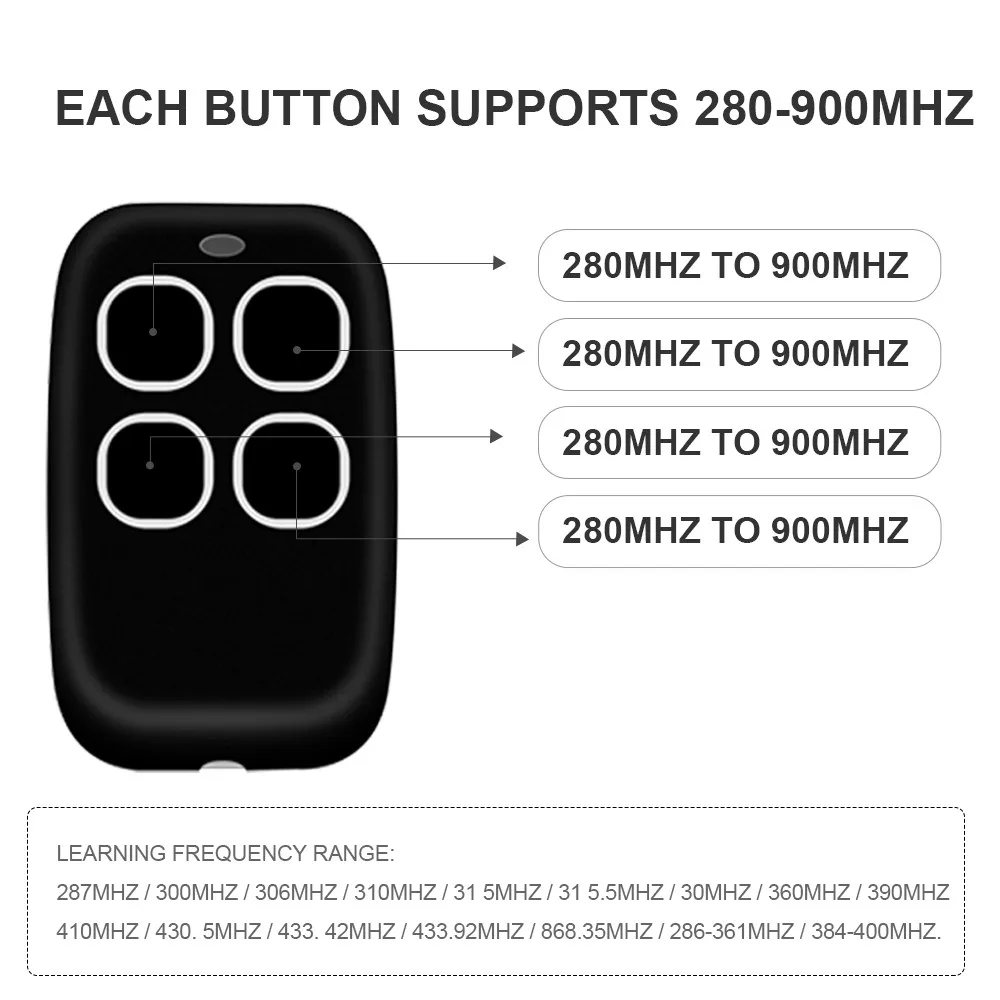 9 , Learning frequency range: 287MHz,300MHz ,306MHz ,310MHz ,315MHz, 315.5MHz ,330MHz, 360MHz ,390MHz, 410MHz, 430.5MHz, 433.42MHz, 433.92MHz, 868.35MHz, 286-361MHz, 384-400MHz.