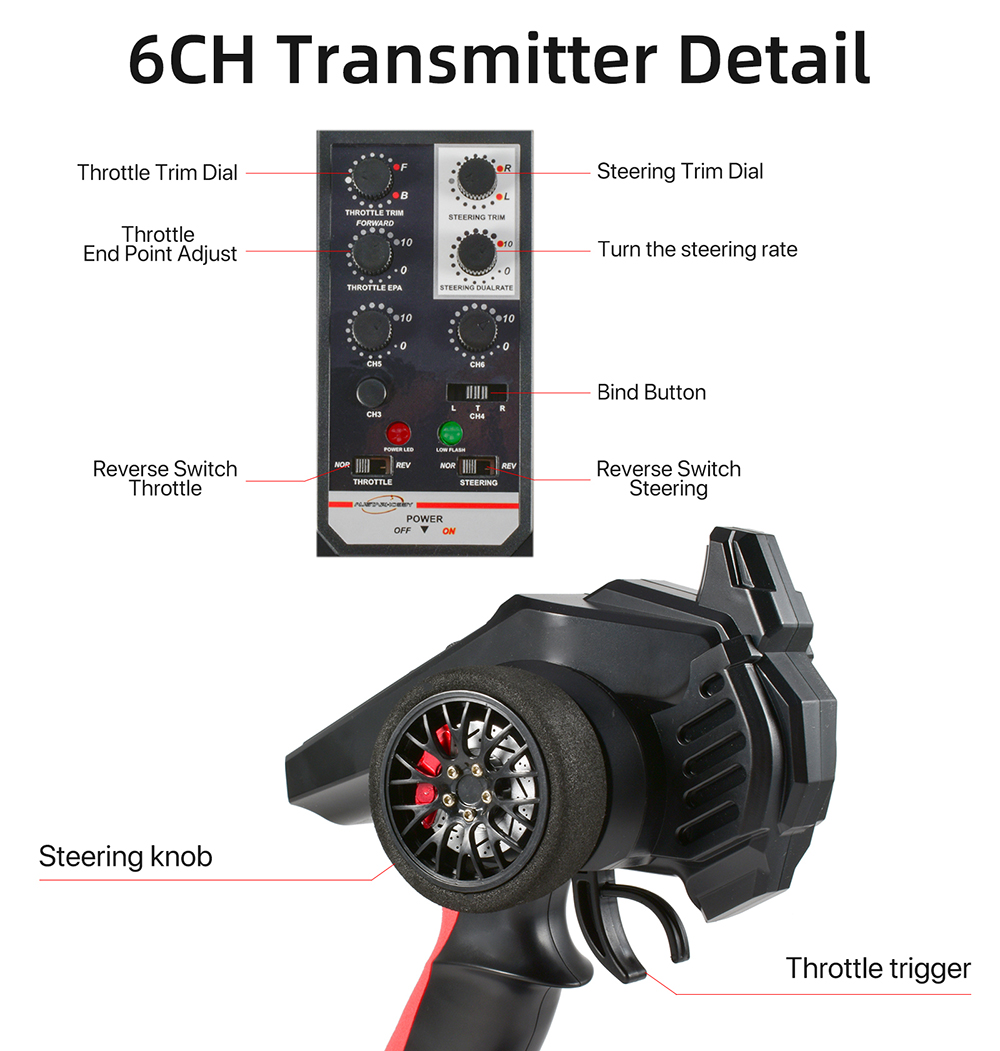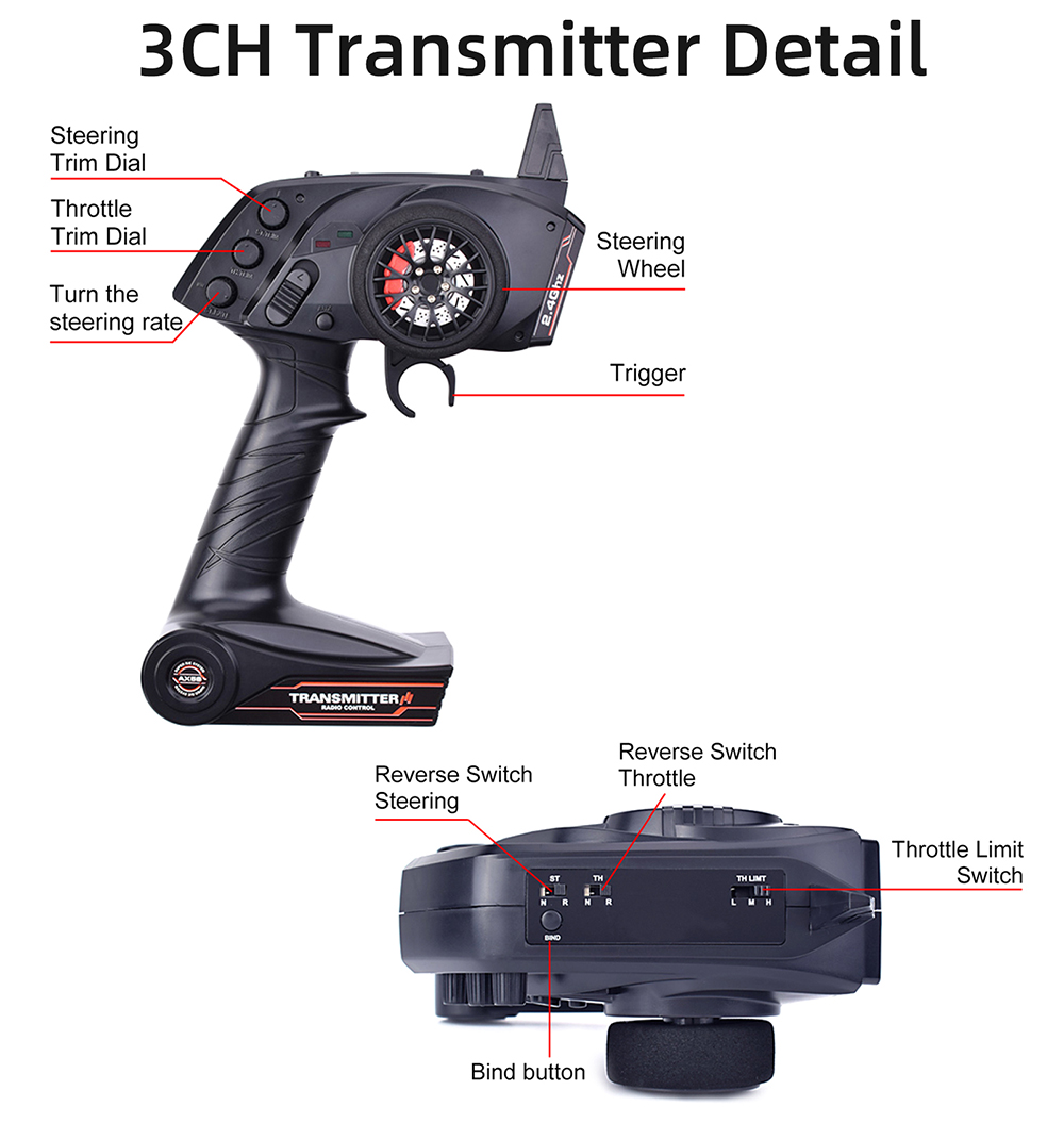 This product is specially developed for remote control cars and boats. It possesses super active and passive anti-jamming capabilities, very low power consumption and high receiving sensitivity. Special speed limit function! Let the beginners can control the car within limited speed range! It has a special Throttle limit switch!
