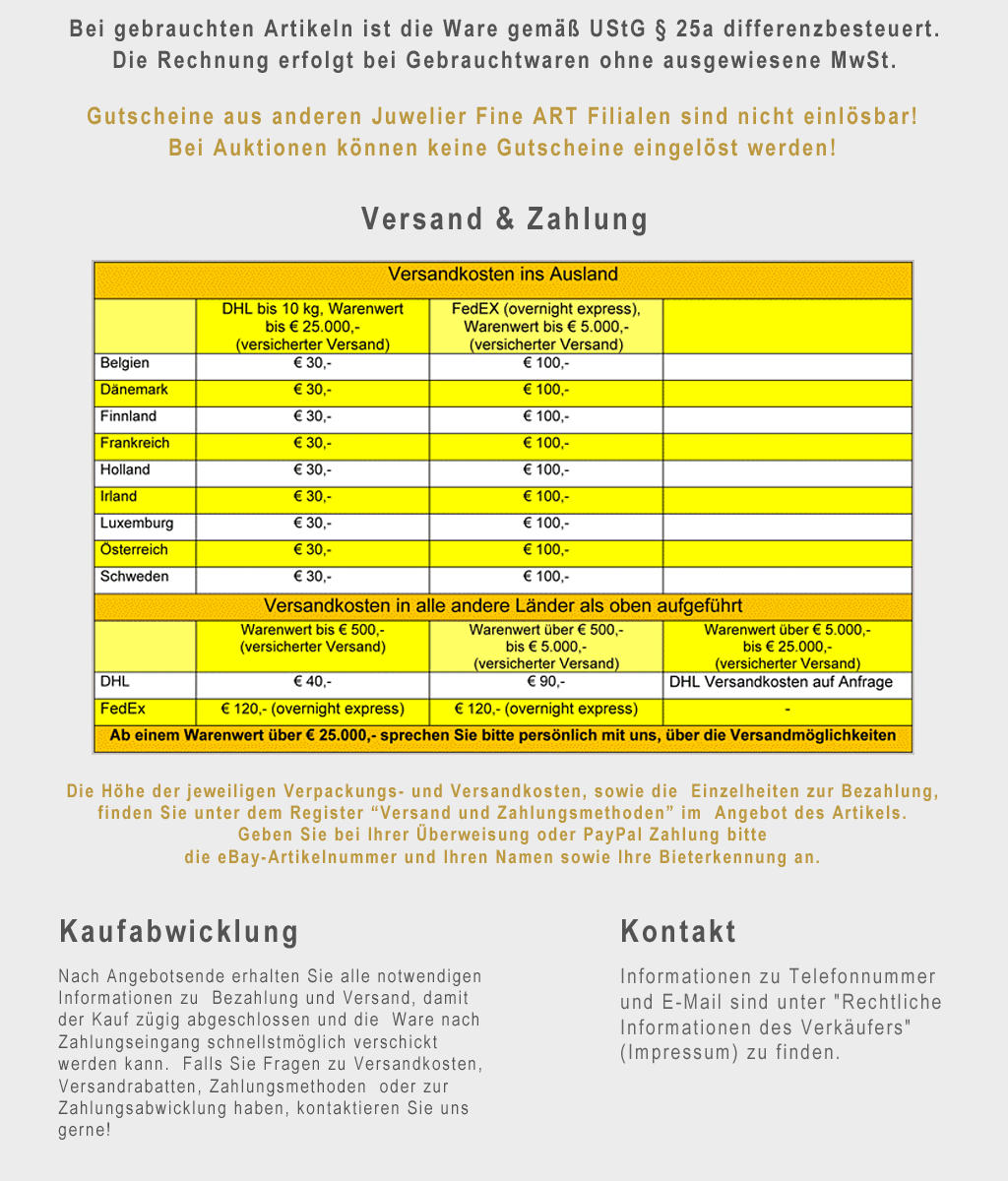 | Papiere: | Juwelier Fine Art Zertifikat mit allen relevanten Daten |