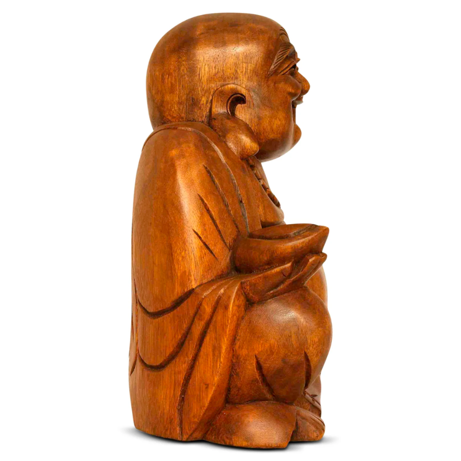 Bestow happiness and wonderful blessings on you or a loved one with this hand-carved, wooden Buddha statue. The deep brown tones of the wood give Buddha a warm appearance that will blend with any decor. Buddha statue is holding gold in his hand symbolizing the riches in your life. This Buddha figurine makes a great gift item for friends or family who appreciate the details of hand-carved wood and the time it takes to create this beautiful work of art.