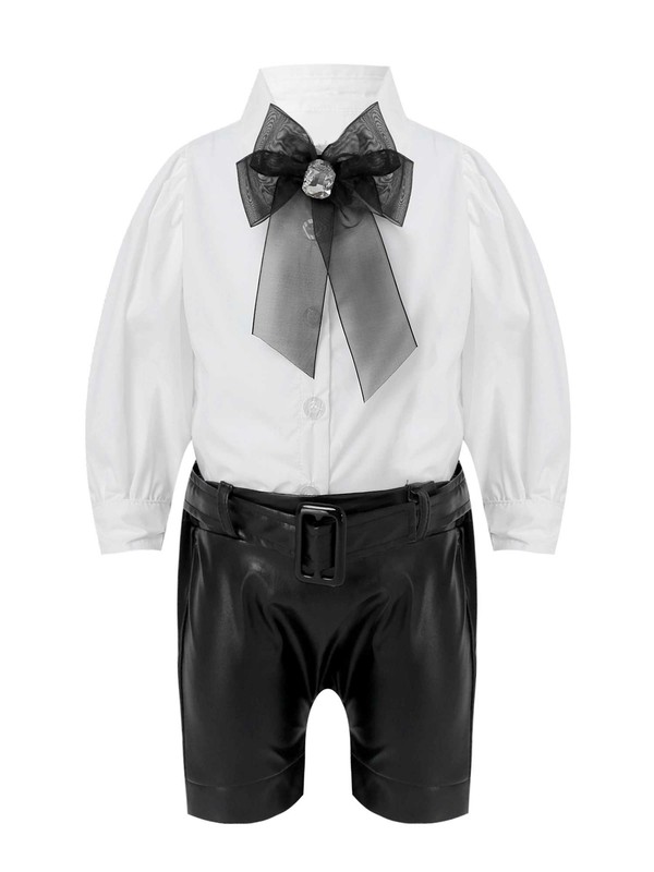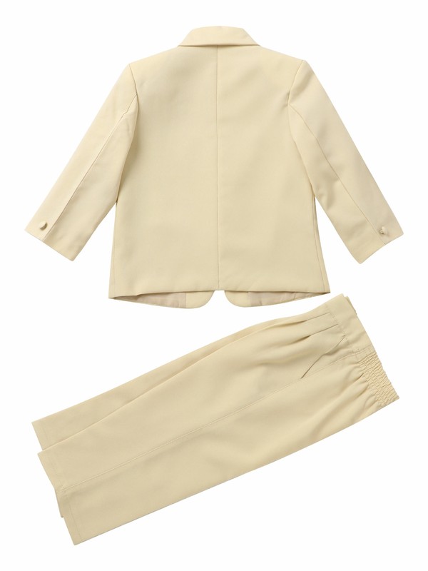 One-button and two pockets blazer, button down vest and long sleeve shirt, elastic waistband long pants, matching with elastic bow tie.