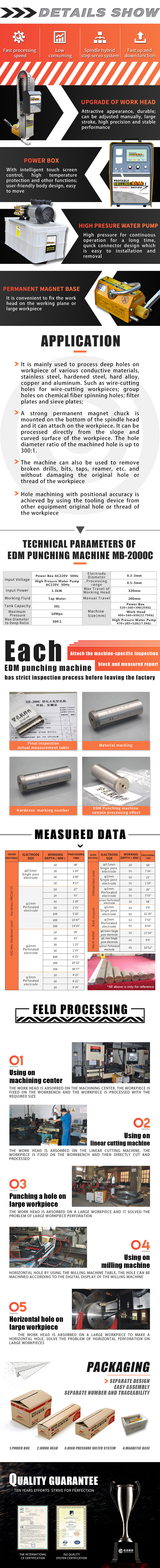 MB-2000C EDM drilling machine can is mainly used to process 0.4mm to 3mm (5/32'' to 1-3/16'') deep holes on work piece of various conductive materials, stainless steel, hardened steel, hard alloy, copper and aluminum and it can also be used to remove broken drills, bits, taps, reamer, etc. and without damaging the original hole or thread of the work piece.
