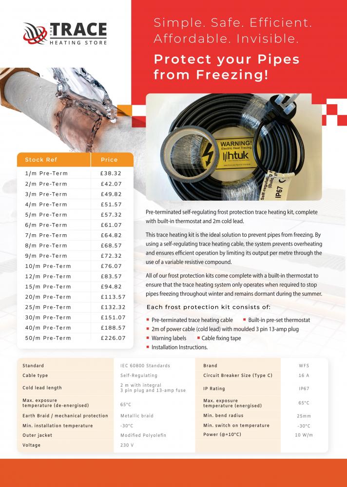 Our Trace Heating Frost Protection Kits comprise of a specified length of 10-13 watts per metre, self-regulating heater cable, a built-in bi-metal thermostat, 2 metres of mains lead (cold tail), 3-pin Mains plug, *twice the length of aluminium foil fixing tape, warning labels (one for every 3 metres of heater cable) and an easy to follow installation instruction. Longer lengths of mains lead can be supplied upon request, please contact us. Note: The Gutter Kits do not have a mains plug fitted as most applications will require to end at a mains supply outlet inside the building utilising as smaller hole as possible.