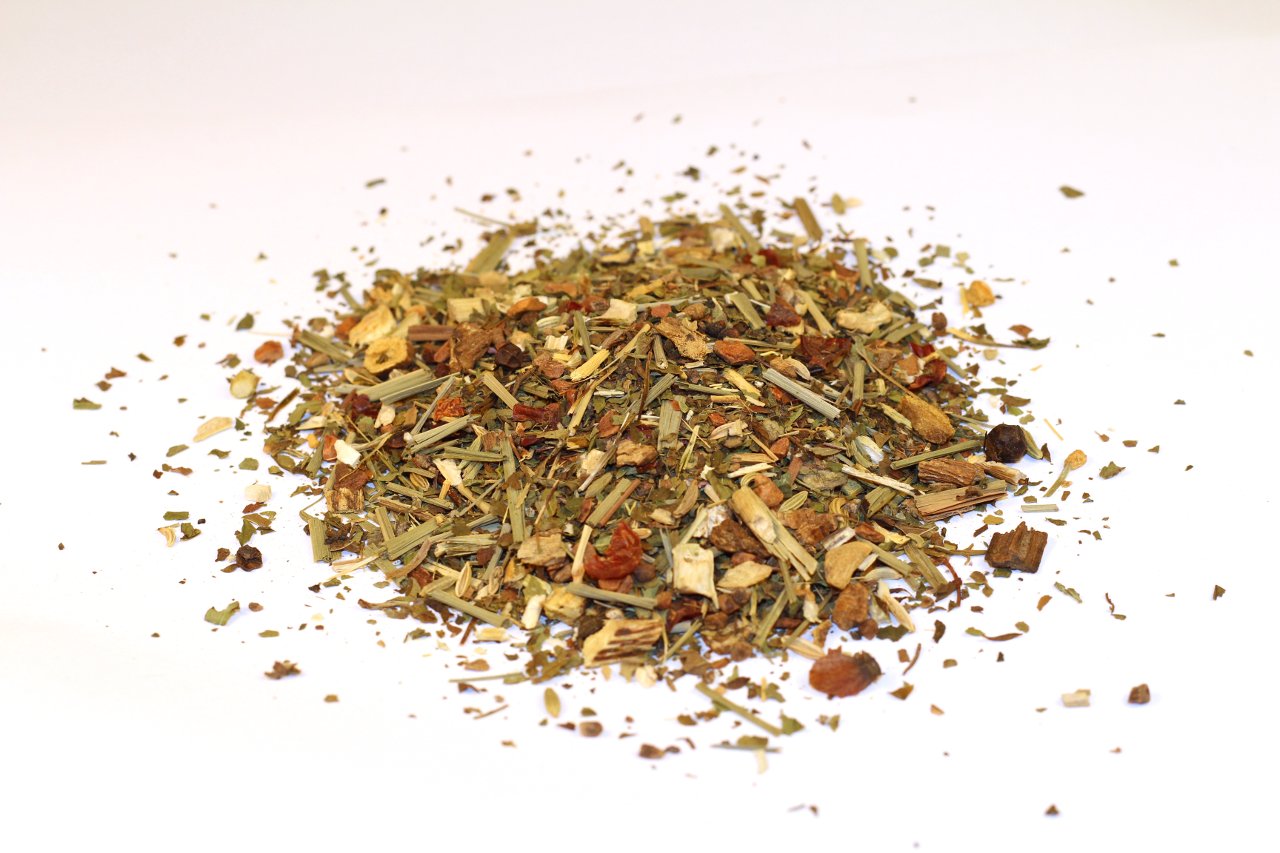 Zutaten: Zitronengras, Zimtstücke, Süßholz‚ Purputsonnenhutkraut, Pfefferminze, Spearminze, Kardamom-Saat, lngwerstücke, Hagebuttenschalen, Fenchel, Klettenwurzel, süße Brombeerblätter, Nelken, Pfefferkörner, Königskerzenblätter, natürliches Aroma