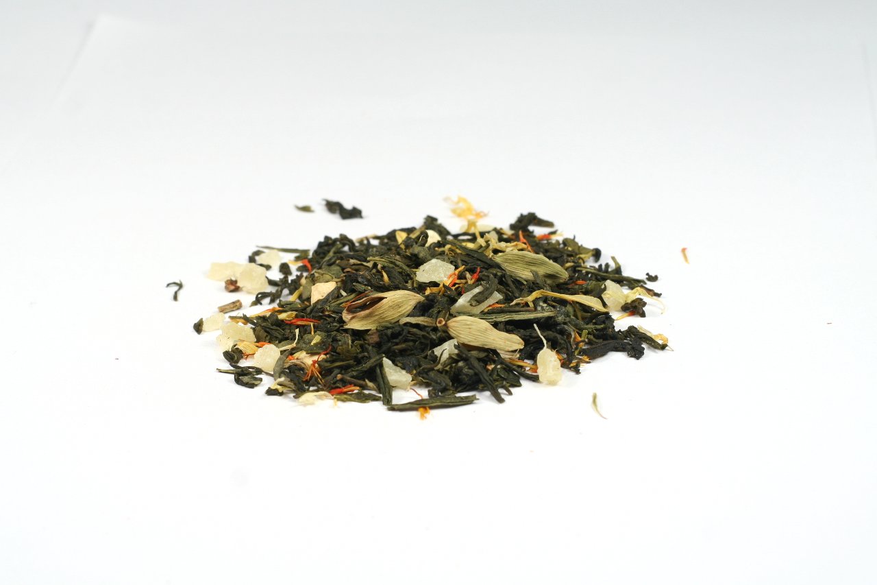 Tee Zutaten: Grüner Tee, kandierte Ananasstücke (Ananas, Zucker), Orangenschalen, natürliches Aroma, Cardamom (1%), Saflorblüten, Ringelblumenblüten, rosa Pfeffer, Aprikosenstücke (0,5%)