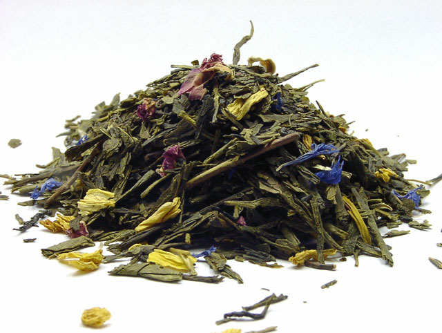 Tee Zutaten: grüner Tee, Sonnenblumenblüten, Rosenblüten, Kornblumenblüten, Aroma
