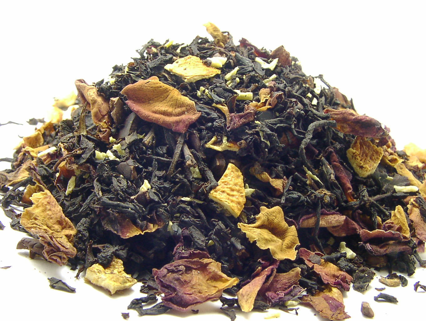Aromatisierter schwarzer Tee für Schleckermäuler mit Schoko-Mandelbiskuit-Geschmack gemischt mit Kakaostücken und Orangen.