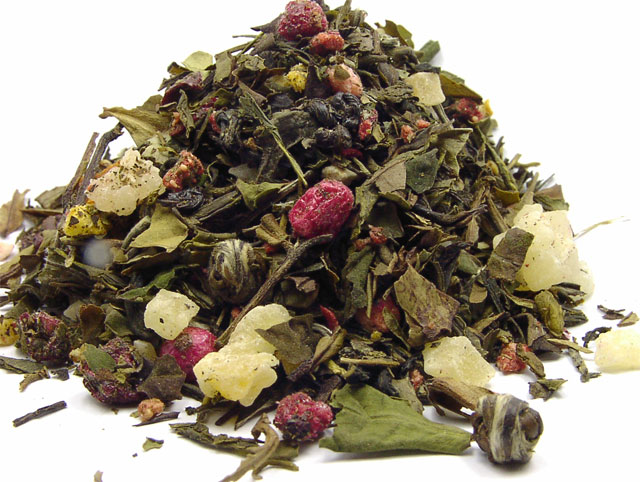 Zutaten von Tempel der Götter: Weißer Tee China Pai Mu Tan, Grüntee Darjeeling, Grüntee China -Nebeltee, -Lung Ching, -Jasmin Jade Pearls, kandierte Ananasstücke (Ananas, Zucker), kandierte Mangostücke (Mango, Zucker), natürliches Aroma, Orangenschalen, kandierte Papayastücke (Papaya, Zucker), Erdbeerstücke, rote Johannisbeeren, Aprikosenstücke(1%), Sauerkirschstücke
