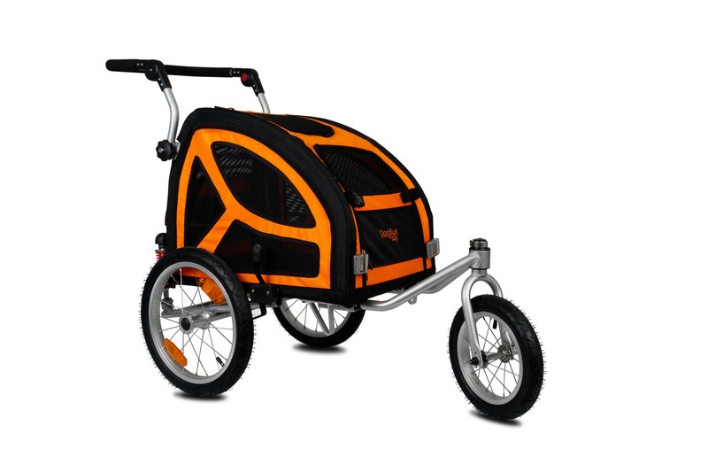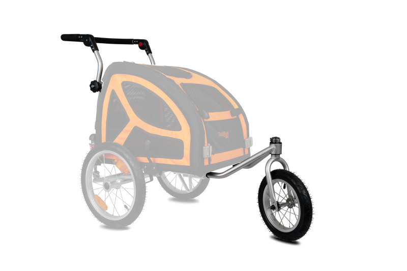 Frage stellenHochwertiges Anbauset aus Aluminium, mit dem du deinen Fahrradanhänger DogBus zum Schiebewagen umbauen kannst. Das Set besteht aus einem gepolsterten Handgriff, der mittels großer Handschrauben an den Seitenholmen befestigt und zu einem großen, soliden Handgriff verbunden wird. Der Handgriff ist durch ein Gelenk in der Höhe verstellbar. Die Fahrraddeichsel wird durch das Entfernen der 2 Schnellspanner abgenommen und durch die Vorderradeinheit ersetzt. Die Vorderradeinheit besteht aus einem 12 Zoll luftgefederten Reifen, der über eine stabile Gabel im kugelgelagerten Turmdrehkranz verankert ist. Durch die Kugellagerung lässt sich der Hänger sehr leicht in jedem Gelände auf der Stelle drehen und manövrieren.