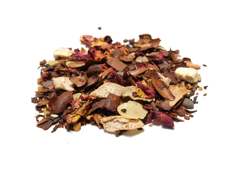 Honeybush, Cacaoschalen, Kakaokernbruch, Krokantstücke (Zucker, Haselnuss, Lactose, Pflanzliches Fett, Glukosesirup), Schokotropfen (Zucker, Kakaomasse, Kakaobutter, Butterreinfett, fettarmes kakaopulver, Emulgator (Soja)), Mandelblätter, Rosenblütenblätter, Aroma, Kokoschips, Joghurt-Crispy (Zucker, Joghurt aus entrahmter Milch, Stärke, Natriumalginat)