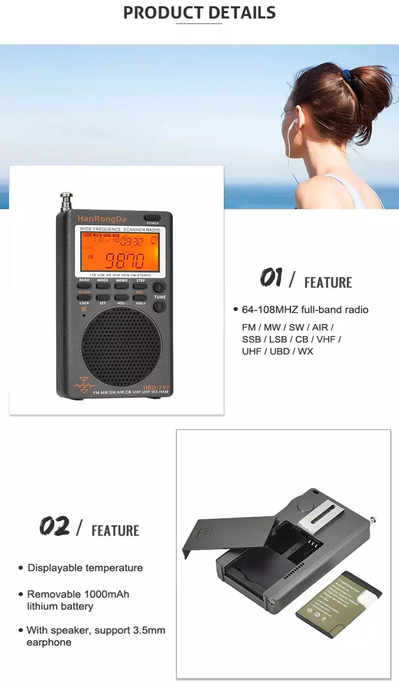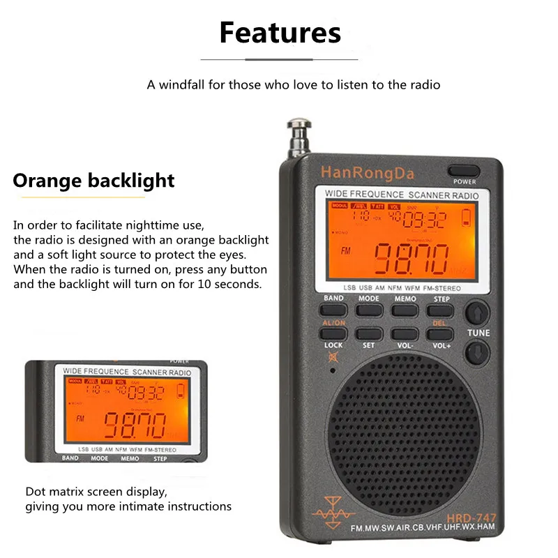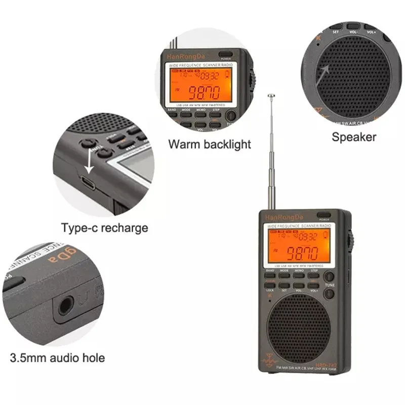 HRD-747 Portable FM/MW/SW/AIR/CB Full-Band Radio Off-Road Enthusiast VHF/UHF