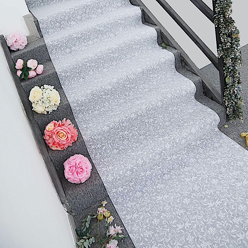 Featuring a non-woven lace fabric with floral design, this aisle runner is sure to make your walk down the aisle a moment to remember.