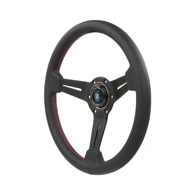 Features: Black perforated leather/red stitching/black anodized spokes/horn button with Nardi logo.
