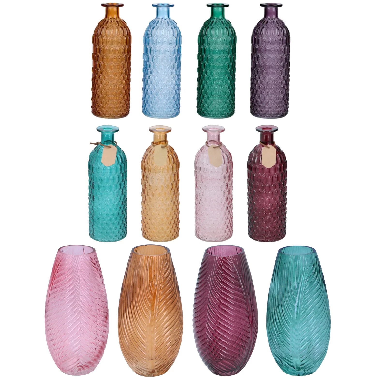 A vase is an excellent way to draw attention to your floral blooms. Made of extra-thick transparent & tinted glass is this exquisite vase in bullet or bottle structures, embossed with honeycomb or leaf patterns. It is a functional interior décor accessory, perfect for real, dried, artificial and decorative floral arrangements.