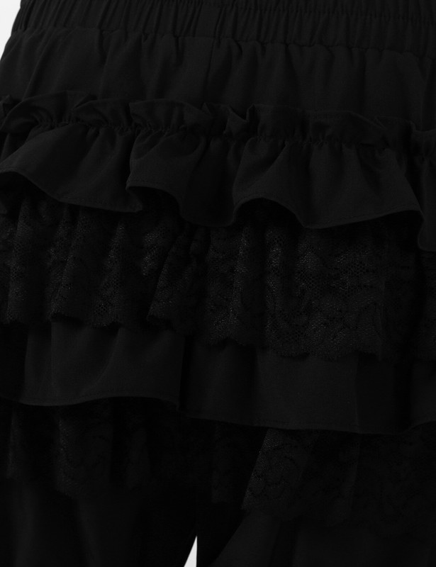 Elastic waist for comfy fit, layered ruffle trim design, stretchy ruffled leg openings with lace trim, loose fit.