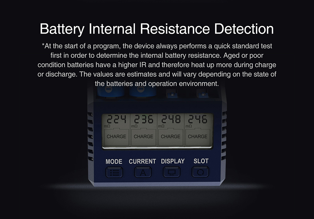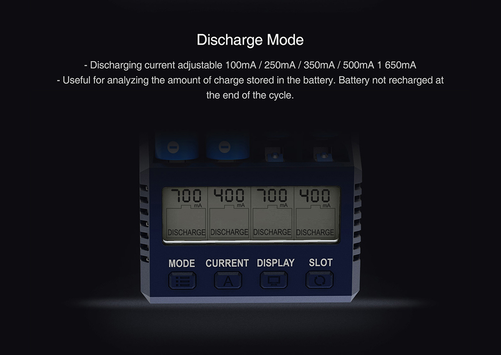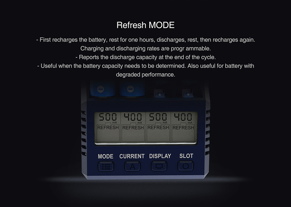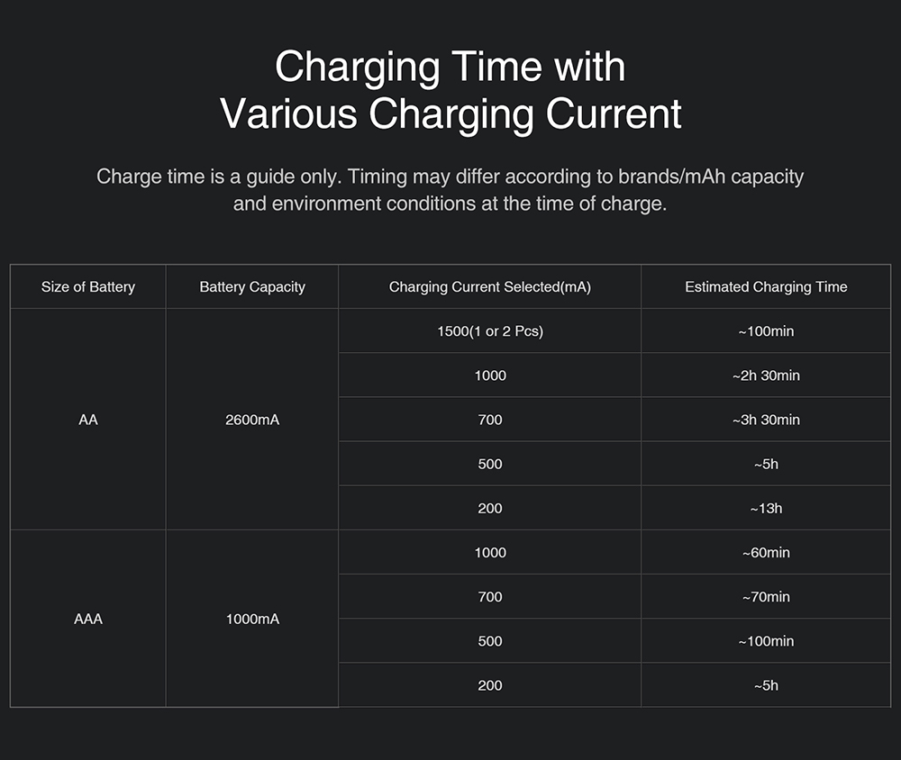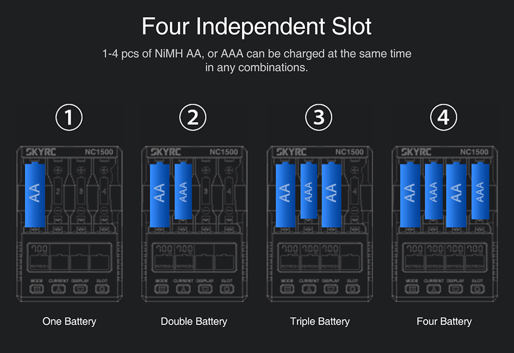 Four independent slots,can charge 1-4 pcs of NIMH AA or AAA in any combinations.