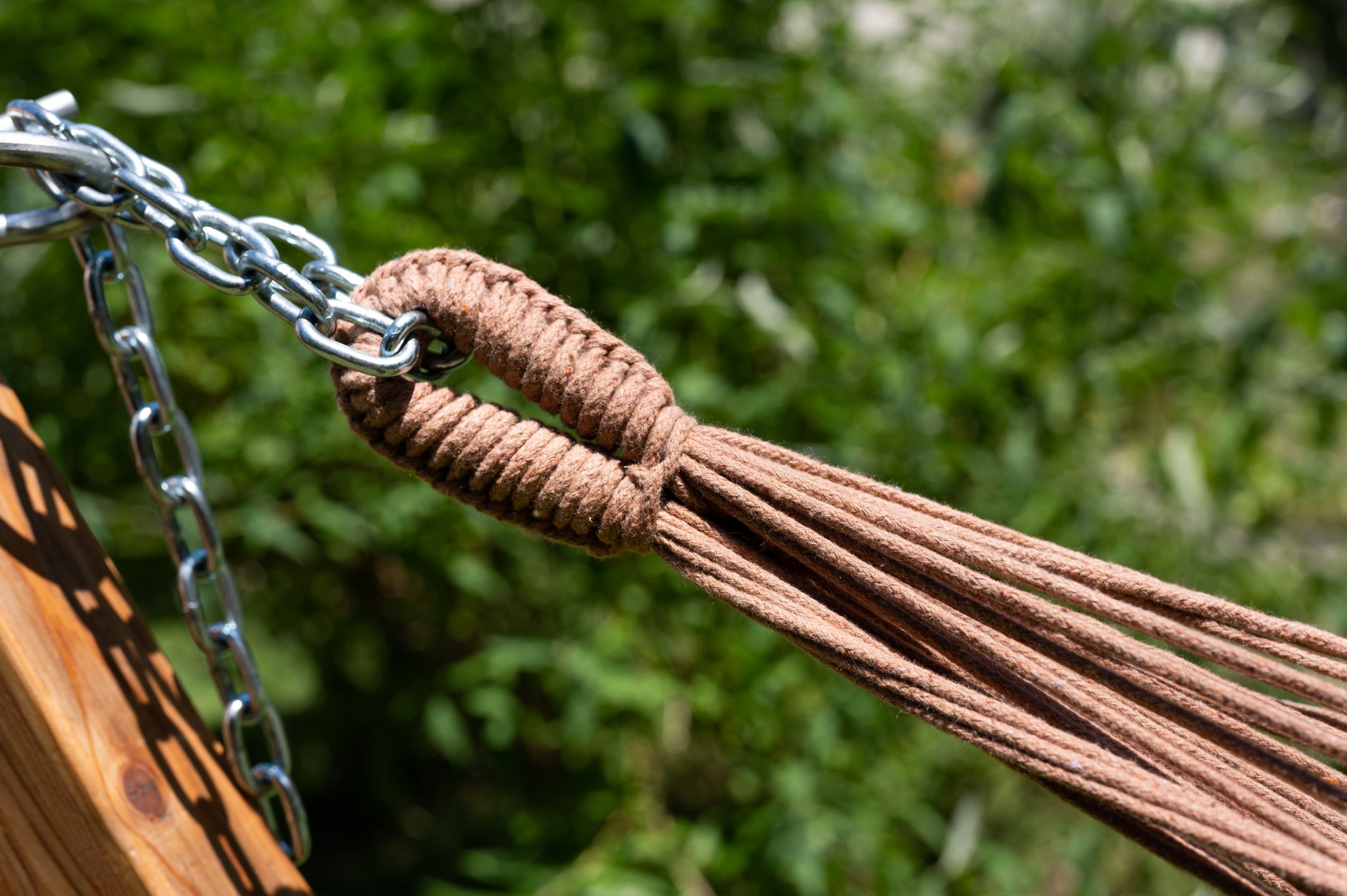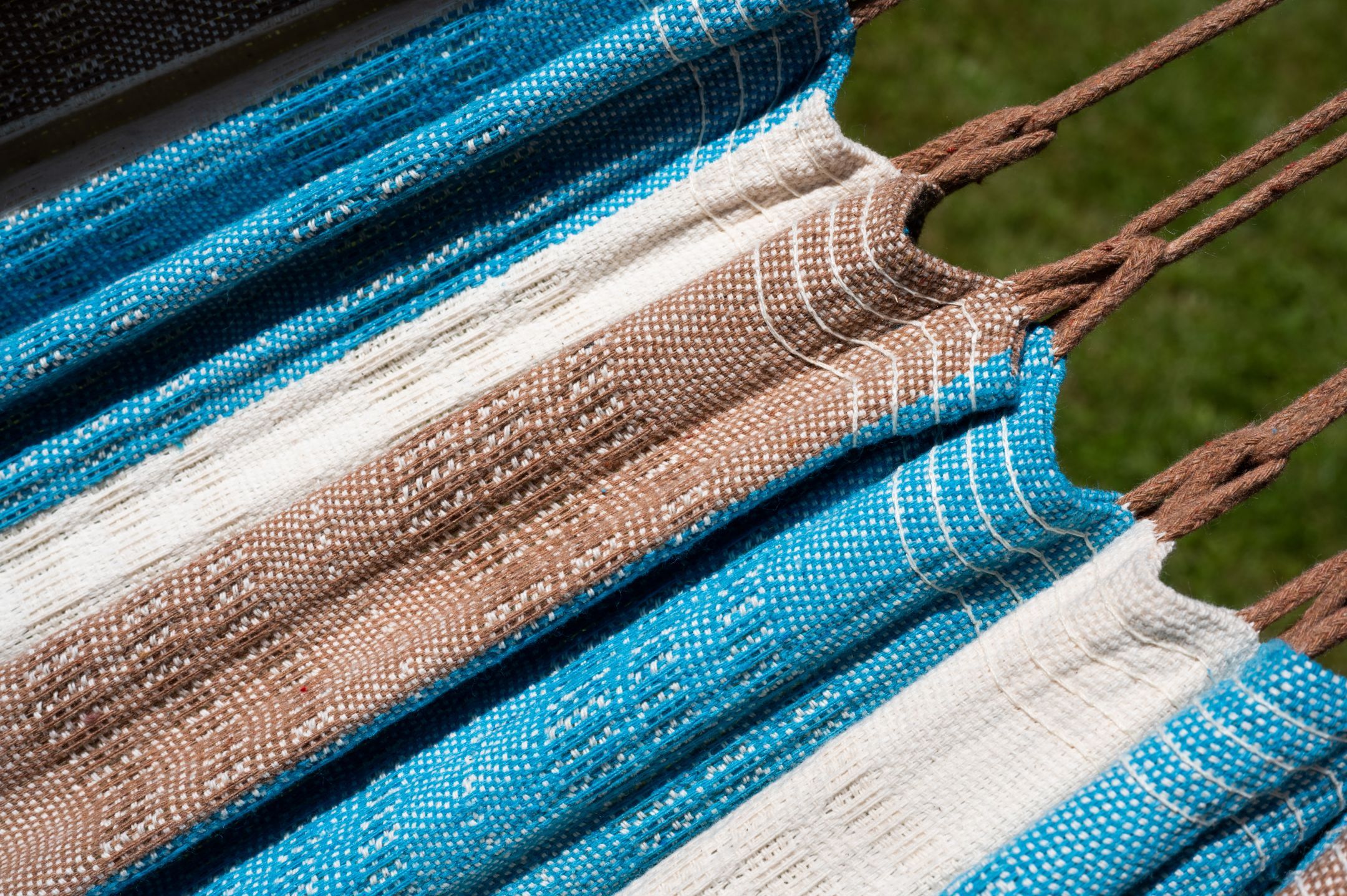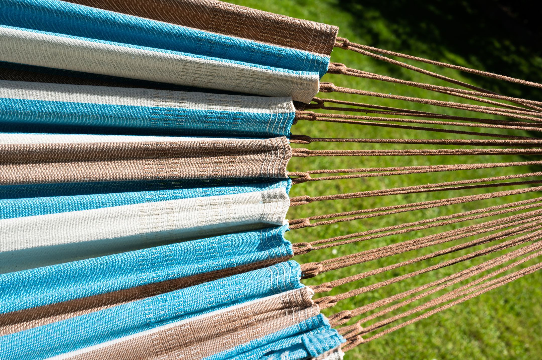 Die Brasilianische Hängematte in blau, braun und natur weiß ist für zwei Personen geeignet. Die Doppelhängematte wurde in Brasilien aus 100% Baumwolle hergestellt. Durch die braunen Aufhängeschnüre überwiegt der erdige Farbton.