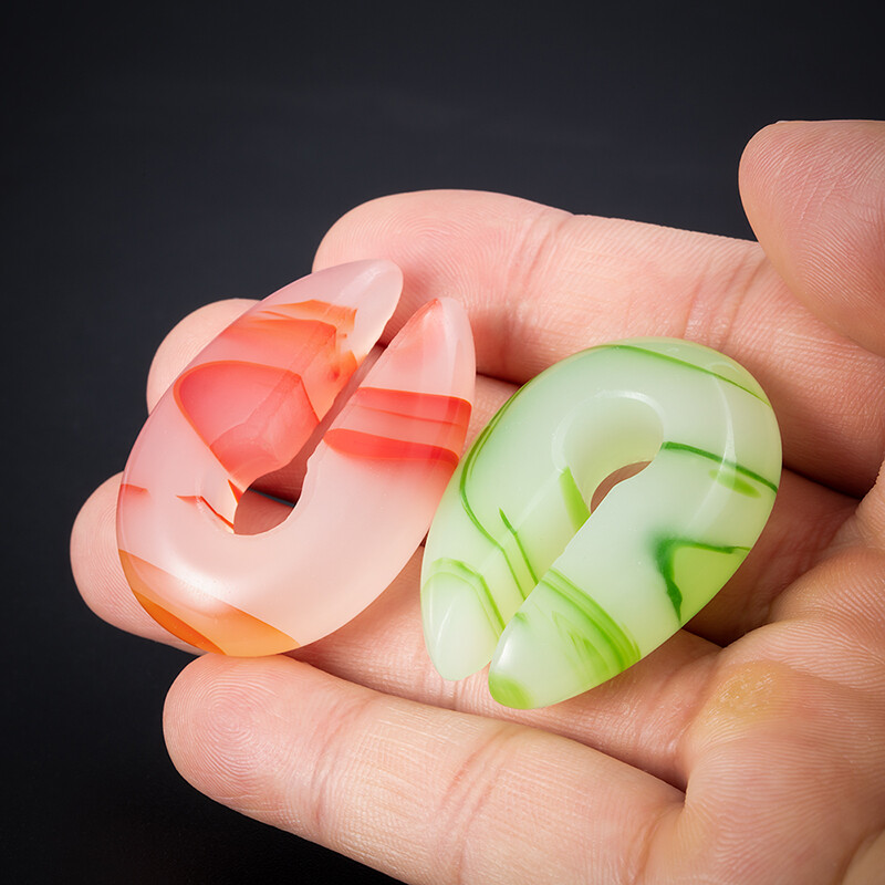 This marbled grained inverted teardrop expander features a straight slit at the bottom that transitions into a small circle, i.e. a keyhole-shaped opening from its underside. At this point, the cone-shaped piercing is pushed through the ear hole, this area is about 12mm wide, so you can only use the dilator from a stretch of at least 12mm. With a slightly larger ear hole, the stretch spiral will still hold due to its weight of around 17g, the part that runs through the ear hole is only 10mm in diameter. Due to the production, the shape and weight of the drop ear stretcher can vary slightly. The inverted drop is approx. 40mm long grained in white with a color reminiscent of marble grain. Since it is real natural stone, the grain is completely different.