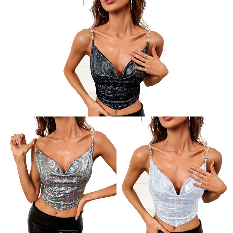 Womens Shiny Cowl Neck Camisole Rhinestone Shoulder Straps Crop Top.