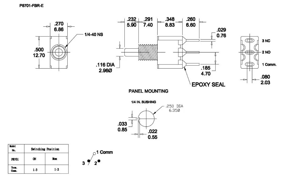 Telecommunications equipment, Computer peripherals. Model:P8701-FBR Operation Type: Momentary (Snap-Acting) Function:ON-MOM Mounting Diameter: 6.35mm (Inch thread