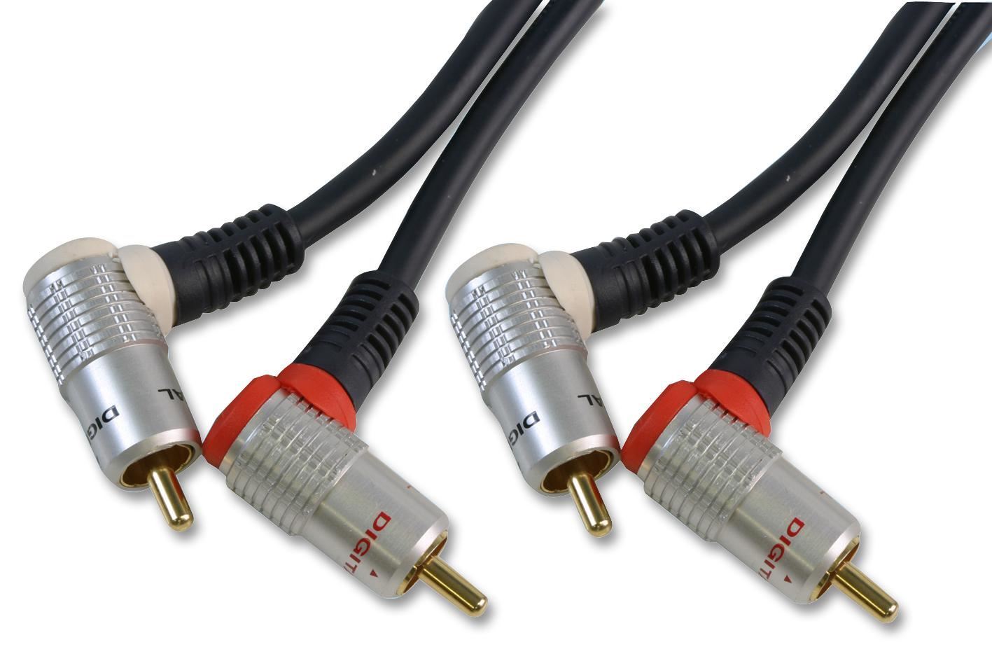 Câbles de haute qualité avec 2x fiches Phono (RCA) à 90° pour des interconnexions audio stéréo. Comprennent un code couleur, des contacts plaqués or et des câbles OFC.