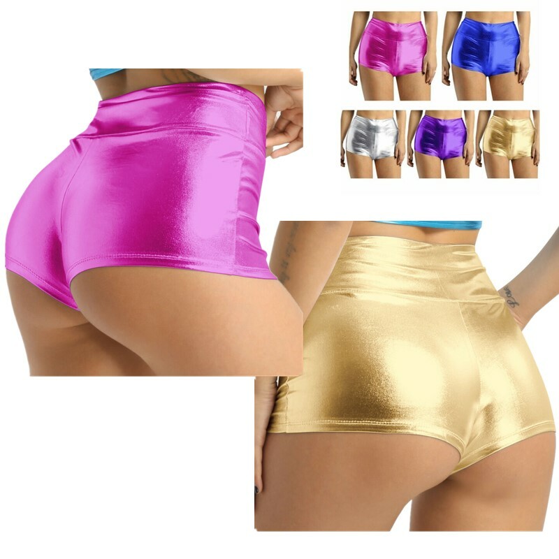 Women High Waist Shorts Shiny Metallic Booty Shorts Hot Pants Yoga Shorts Gym