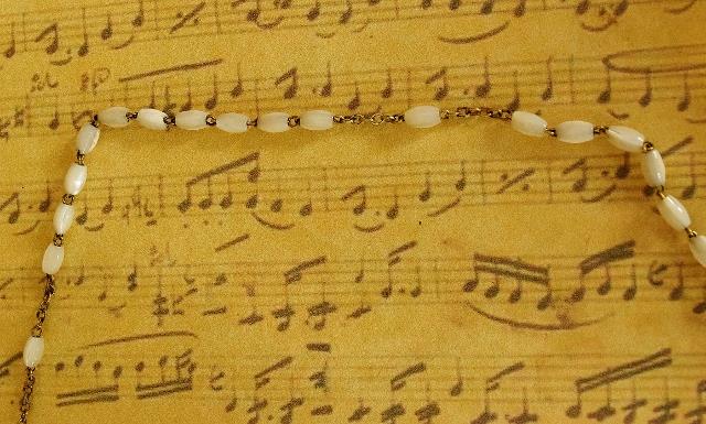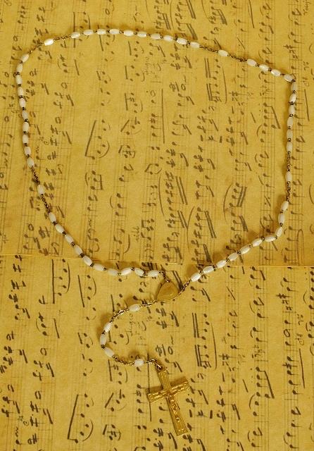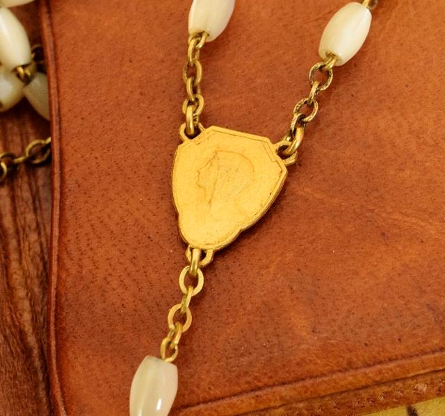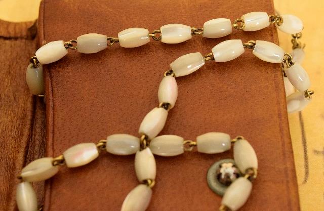 The Mother of Pearl rosary is held in a matching gold embossed leather pochette.