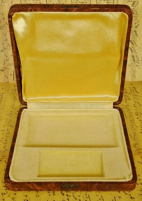 The Missel and pochette are held in a paper covered hinged presentation box with a clasp. The base of the box is covered in a beautiful yellow velvet and the underside of the lid is lined with yellow satin.