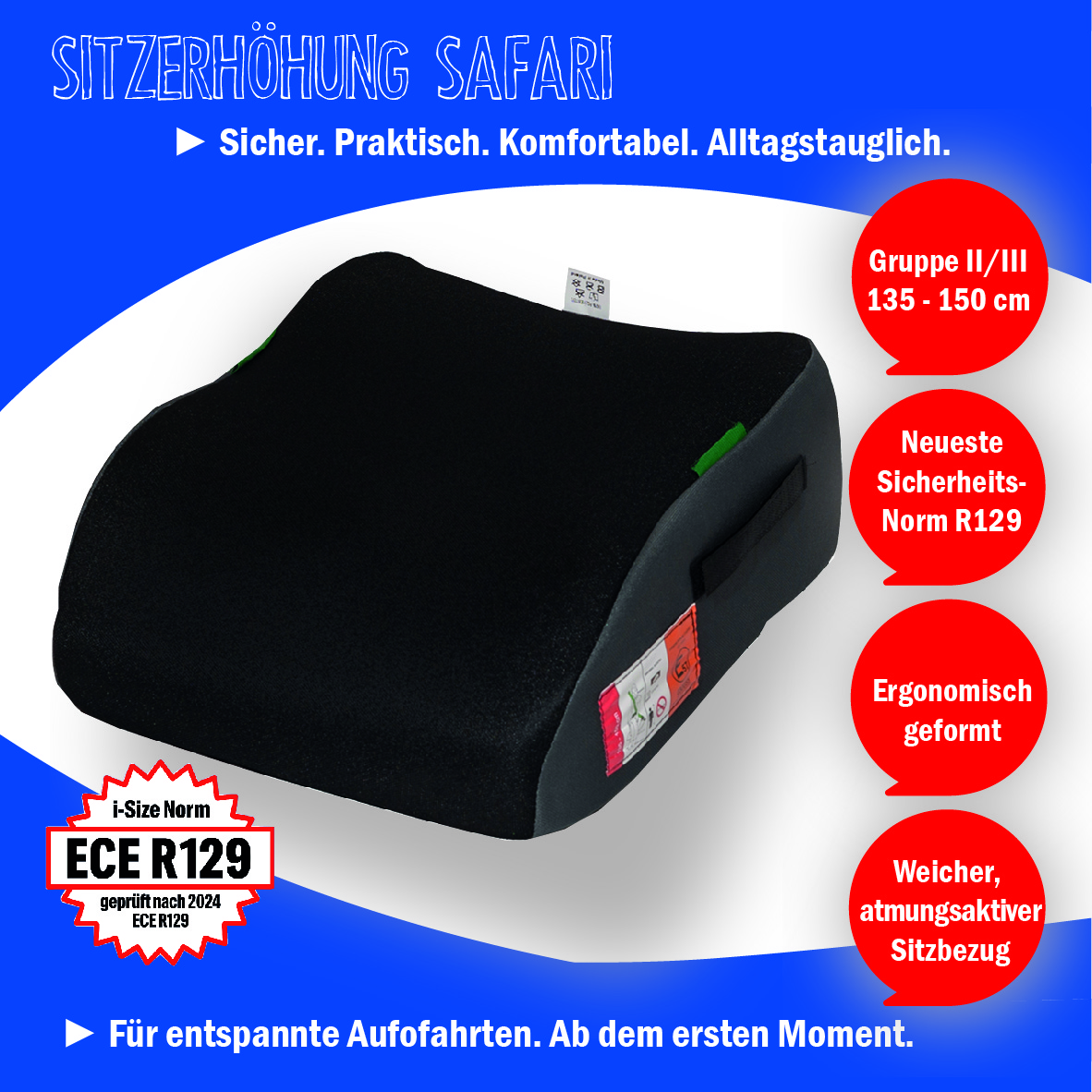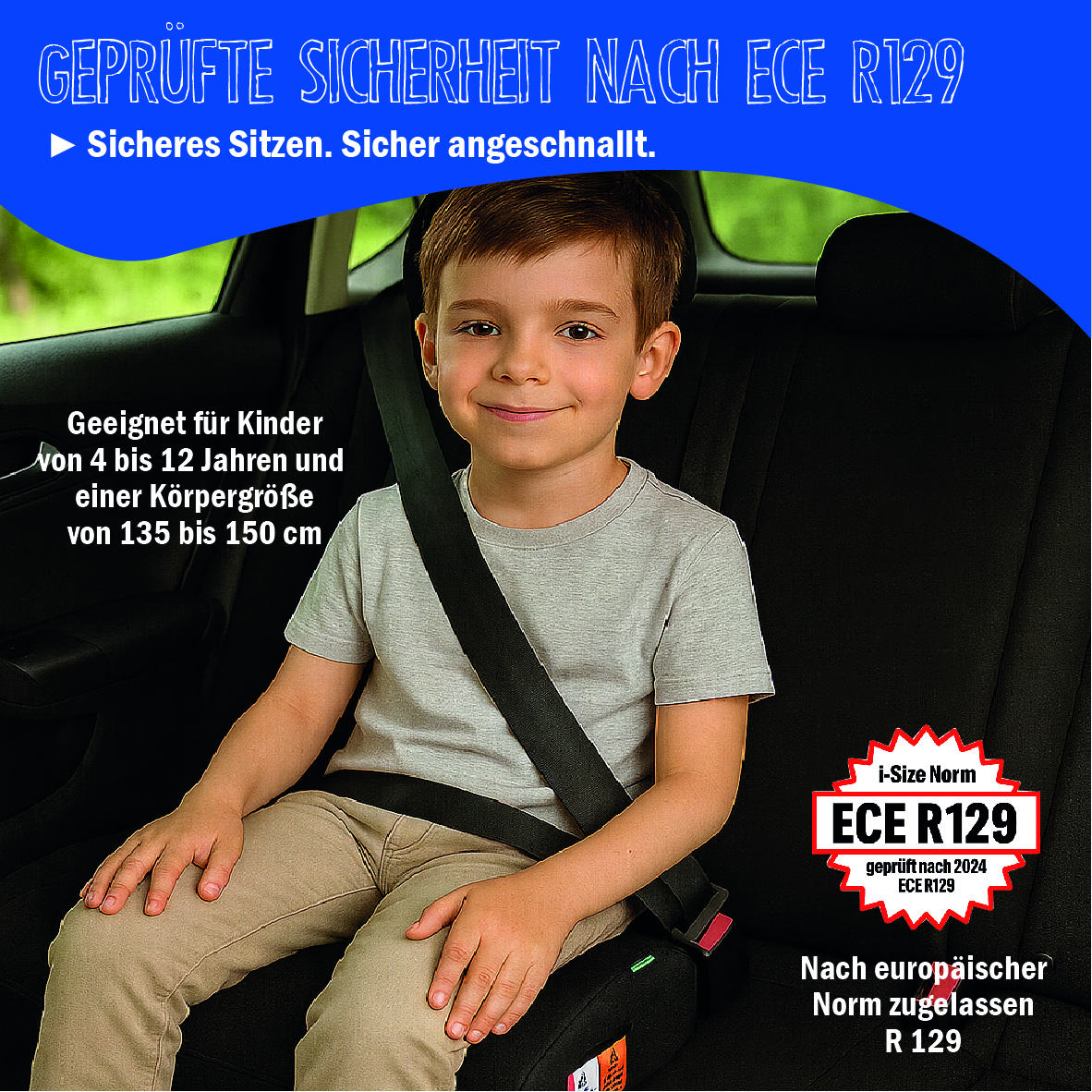Die Autositzerhöhung Safari von UNITED KIDS erfüllt alle aktuellen Sicherheitsstandards und ist nach der neuen europäischen iSize Prüfnorm ECE R129 getestet und zugelassen. Diese Sitzerhöhung ist speziell für Kinder mit einer Körpergröße von 135 bis 150 cm geeignet, was in etwa einem Alter von 6 bis 12 Jahren entspricht.