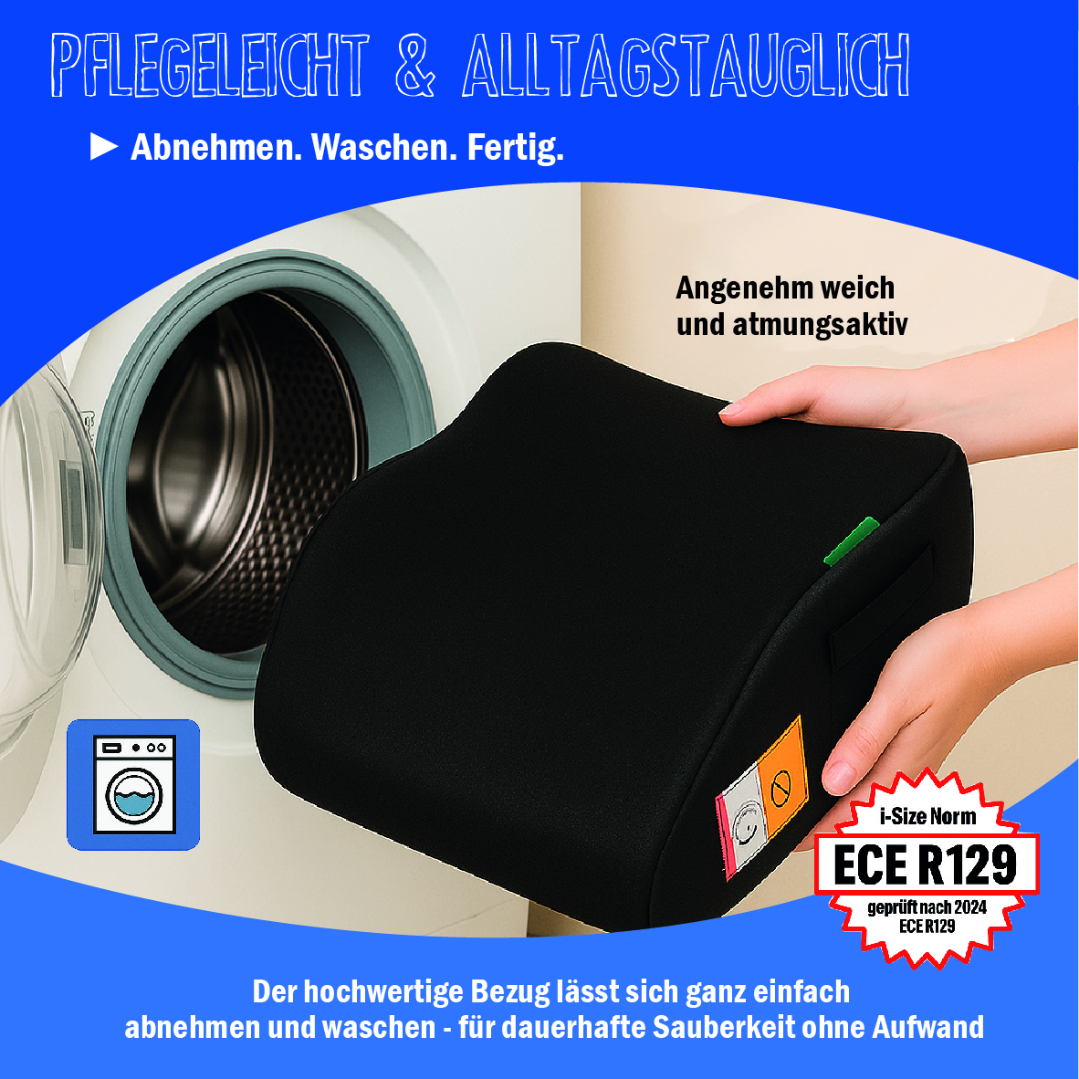 Der weiche und atmungsaktive Sitzbezug ist nicht nur strapazierfähig, sondern auch abnehmbar und bei 30° Grad waschbar. Erhältlich ist die Sitzerhöhung in den Farben schwarz, blau und rot, sodass Sie die passende Farbe für Ihr Fahrzeug auswählen können.