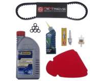 Das Set beinhaltet hochwertiges teilsynthetisches Motoröl, eine zuverlässige Zündkerze vom Typ BPR6HS sowie Getriebeöl für eine reibungslose Funktionalität. Ebenso enthalten sind ein Benzinfilter und ein Luftfiltereinsatz, die für eine optimale Motorleistung sorgen. Ein robuster Keilriemen und präzise abgestimmte Variomatikgewichte (17x12, 6,0g) vervollständigen das Paket.