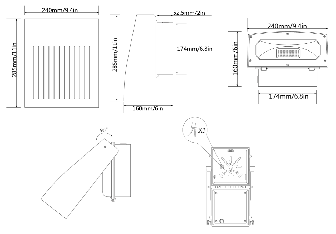 100W LED Wall Pack with adjustable angle is a perfect choice for lighting entrances and walls.You can set the light fixture in any suitable direction. With 100 Watt of power and 11500 Lumens this wall pack can light up large areas. It works perfectly in residential, commercial and industrial entryways, parking lots, warehouses, barns and more. Using Samsung LED chip latest generation allows us to guaranty long lasting service life. It can save you up to 85% on your energy bill.
