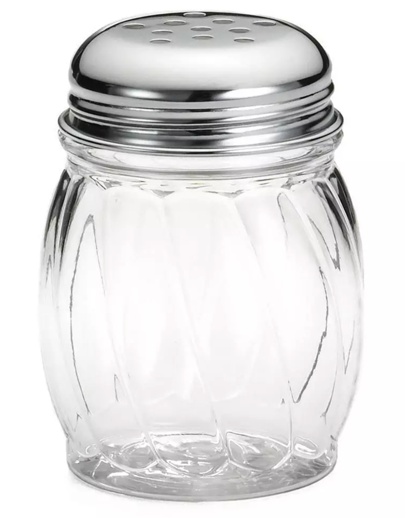 This parmesan cheese, red pepper flake, or Italian seasoning shaker is a must-have for any pizza night. The perforated top makes dispensing the cheese or pepper flakes simple and the glass jar holds up to 6 ounces. The top is made of stainless steel. The top unscrews to make refilling the cheese or spices simple.