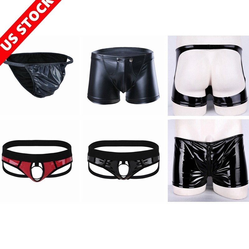 Men Wet Look Boxer Briefs High Cut Thong Panties Zip Drawstring Shorts Bottoms