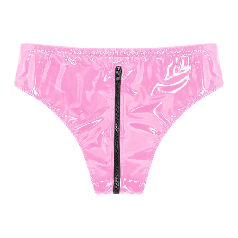 Glossy appearance, low waist briefs with drawstring waistband for better fit, zipper closure.
