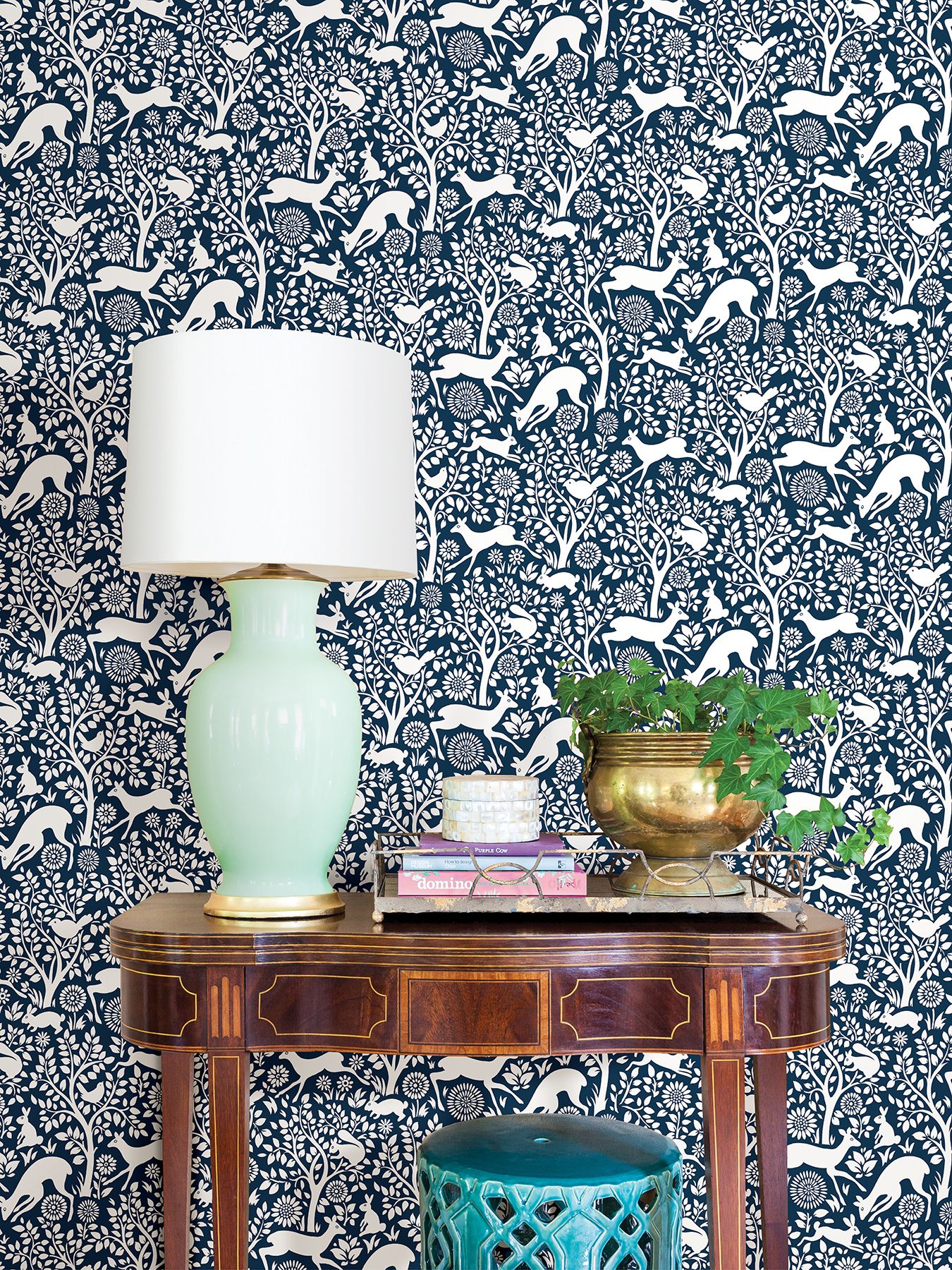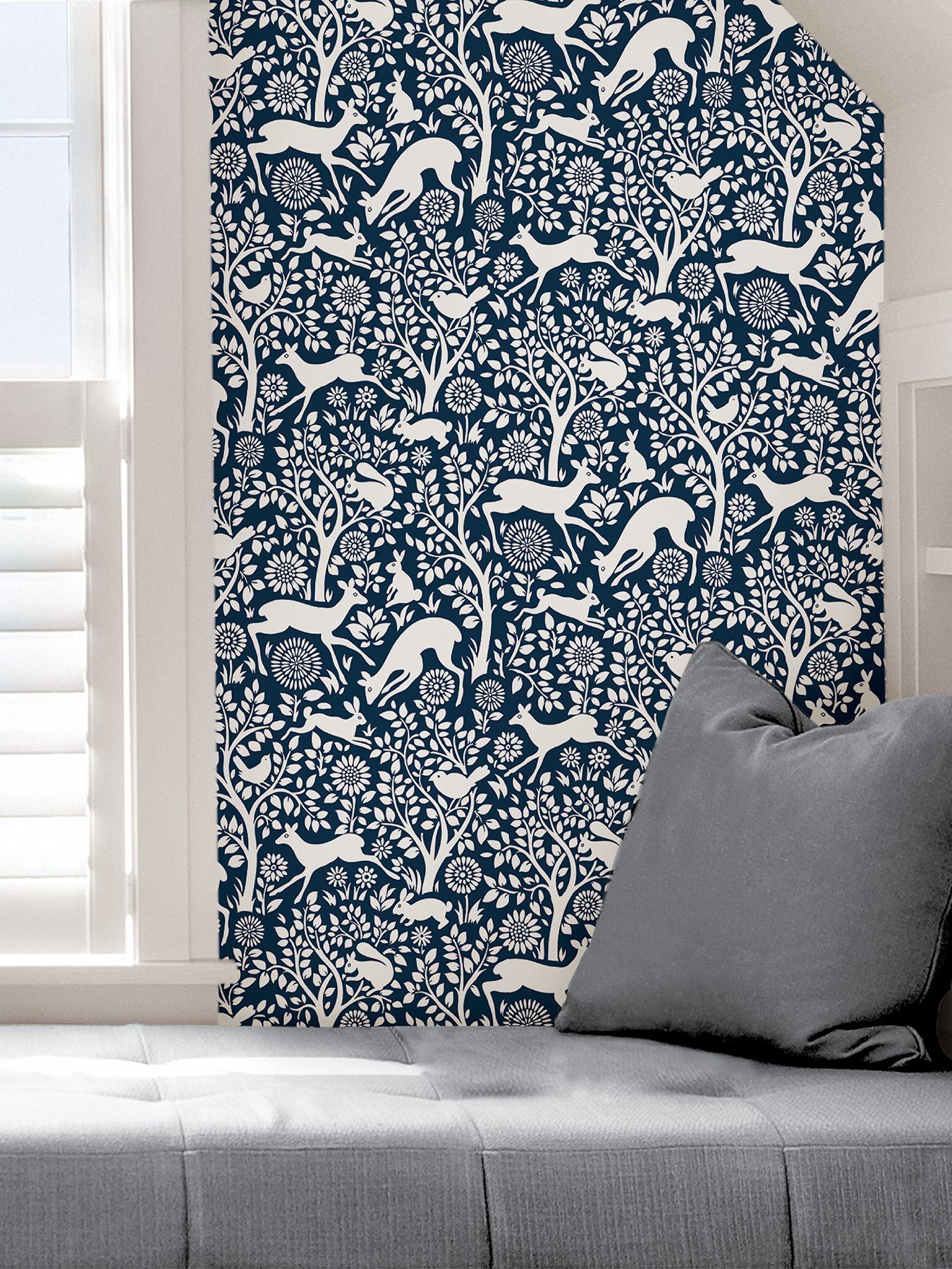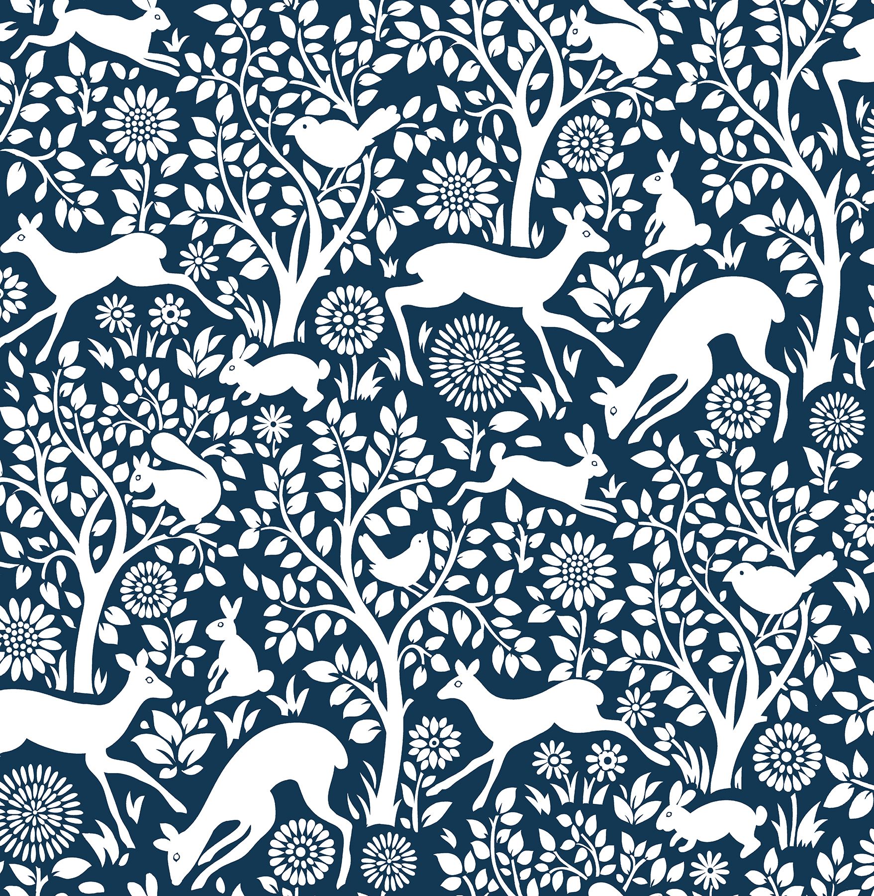 NUS4287 Merriment Peel & Stick Wallpaper with Songbirds Deer Bunnies and Squirrels in Navy Blue Colors Bohemian Style Peel and Stick Adhesive Vinyl