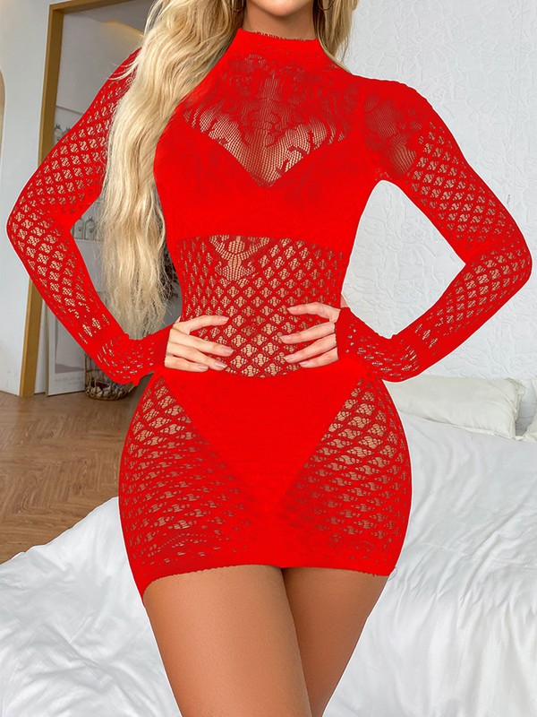 Womens Hollow Out Fishnet Bodycon Dress Mock Neck Long Sleeve Backless Mini Dress.