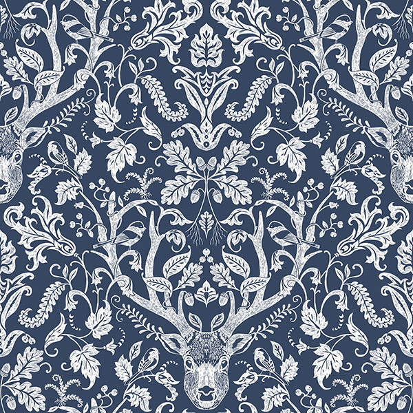 Chesapeake by Brewster 3118-12703 Birch & Sparrow Kiwassa Navy Antler Damask Wallpaper