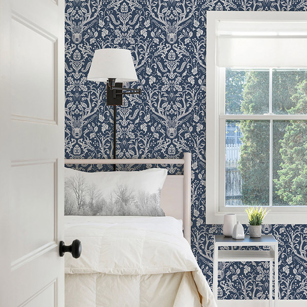 Whimsical meets lodge with this enchanting wallpaper. Its dreamy white damask pattern, featuring song birds, stags and vines, pops against a rich navy background. Kiwassa is a prepasted, easy walls wallpaper.