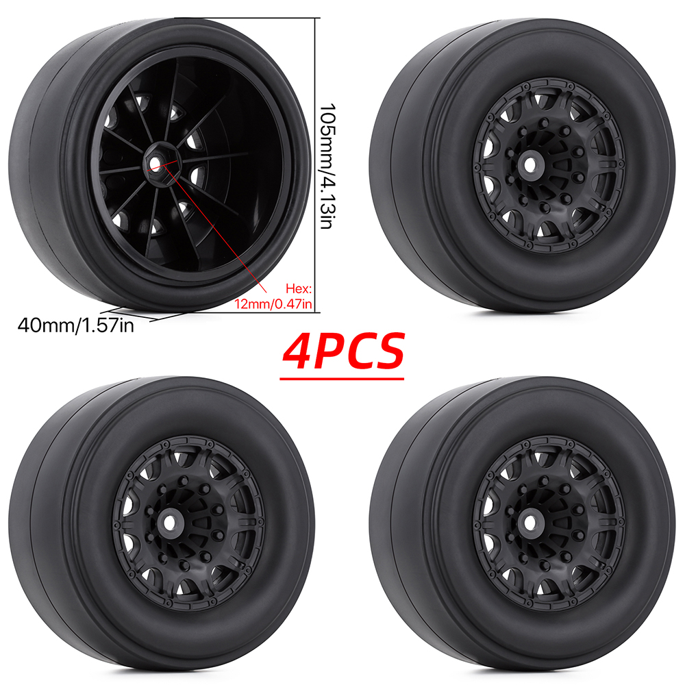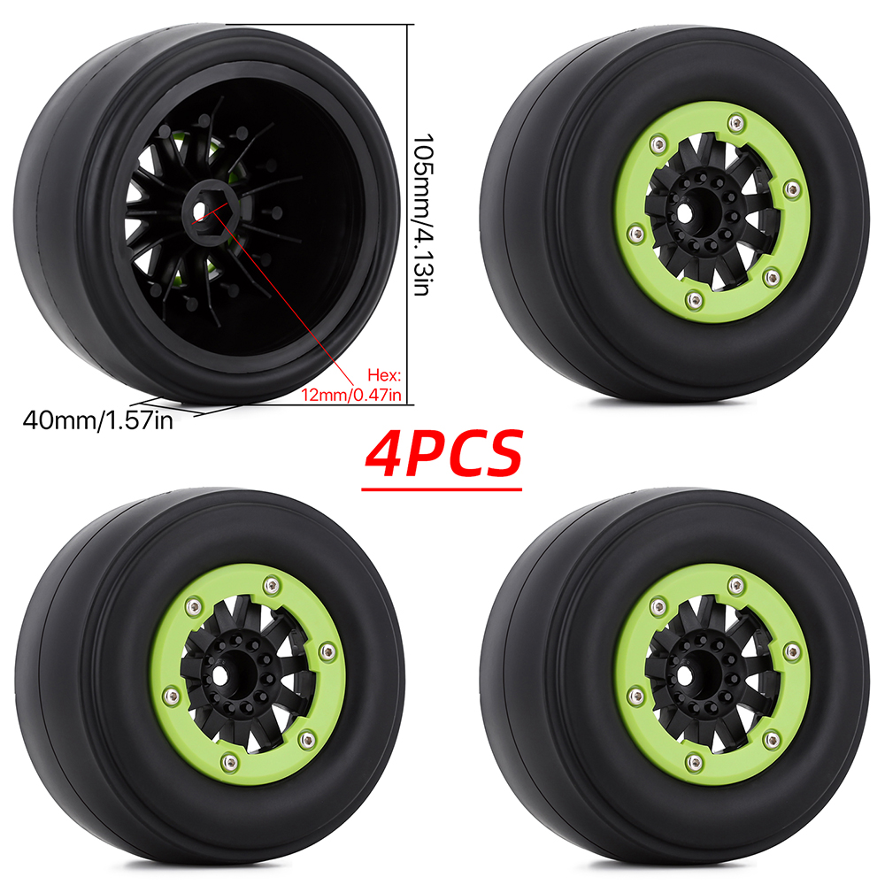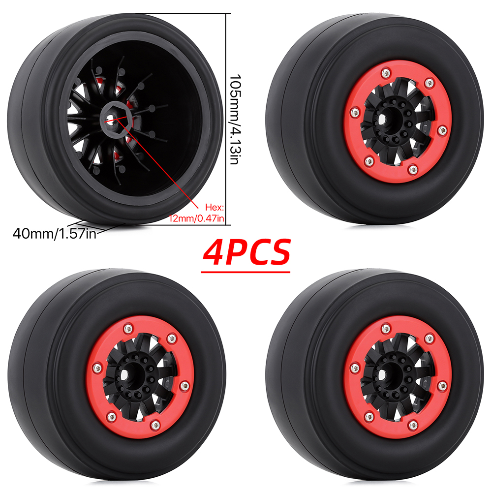 1.RC Vehicle Wheels and Tires Size: The size of our RC Wheels and Tires, Diameter: 105mm / 4.13in Width: 40mm / 1.57in Drive Hex:12mm / 0.47in