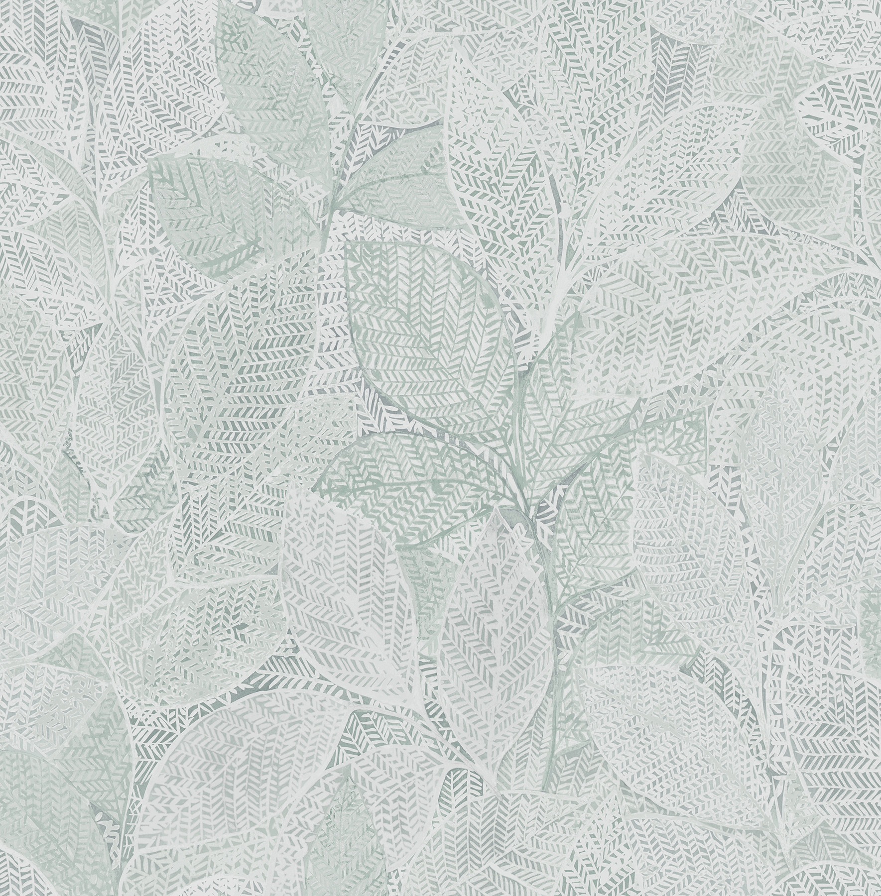 This leaf print wallpaper has an artistic etched look. The design has a green background and white etched effect. The pattern never stops in this design, creating a dimensional pattern.