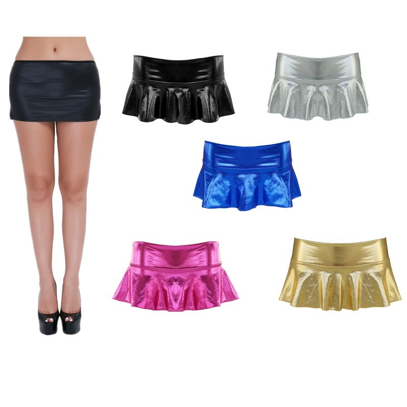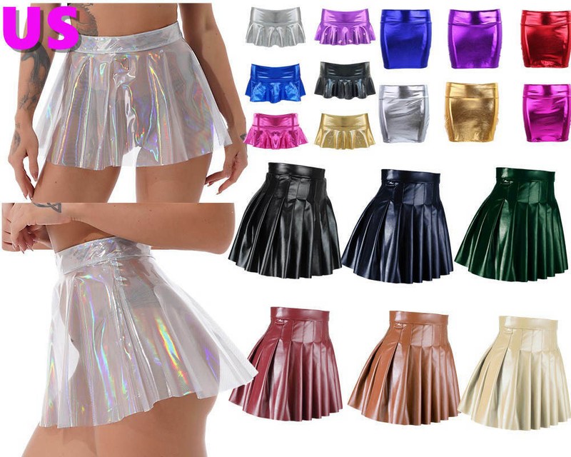 Women Glossy High Waist Flare Skirt Club Stage Costume Party Dancewear Shiny Metallic Ruffle Skirts.